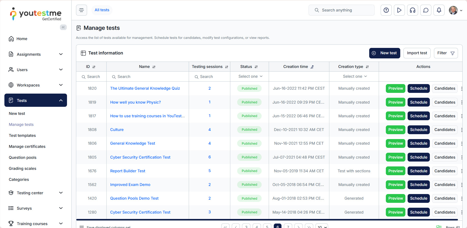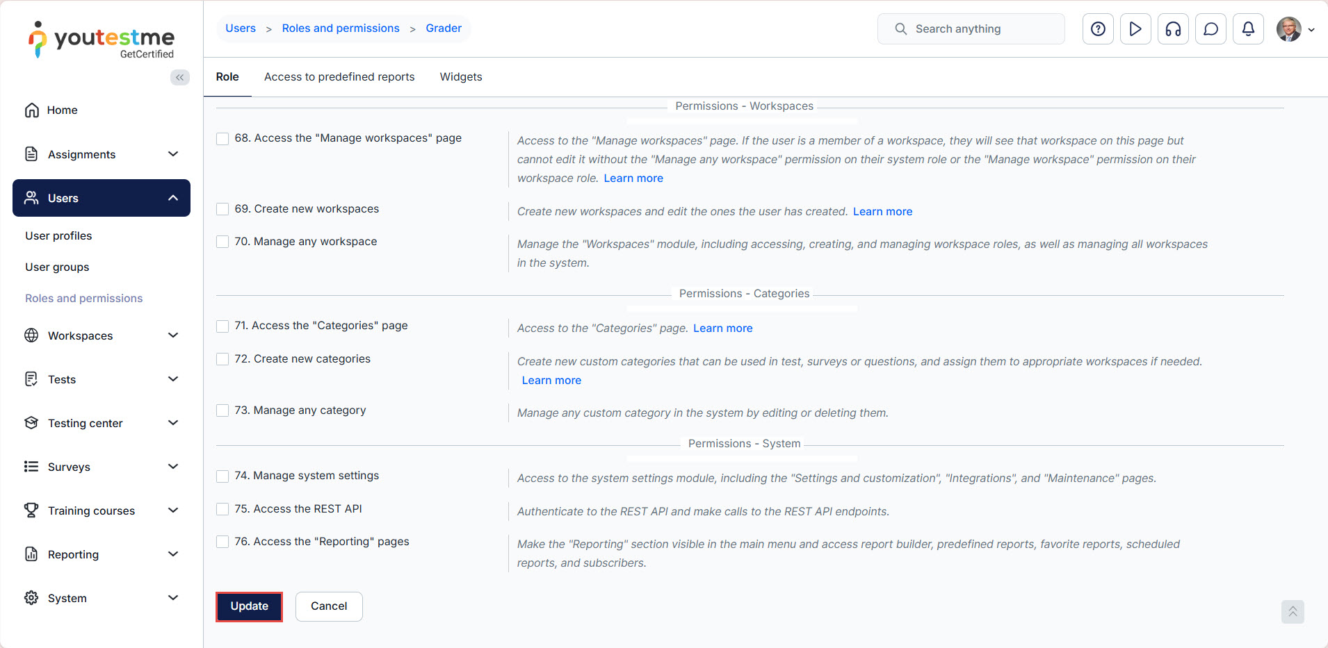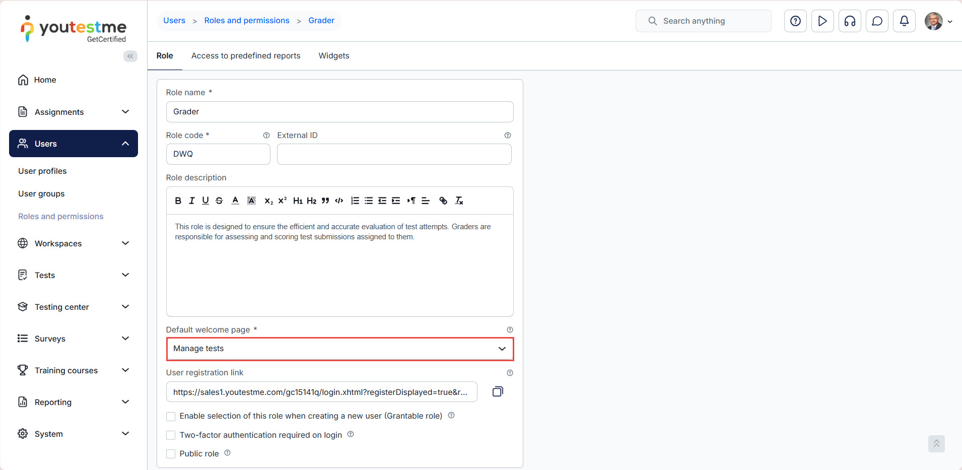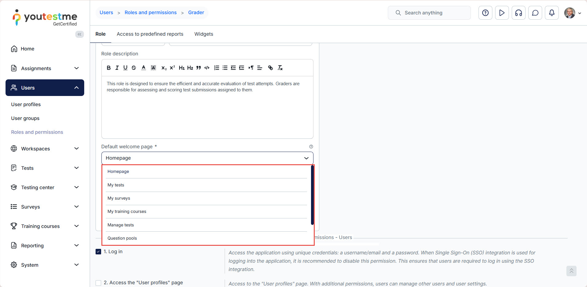 YouTestMe allows administrators to customize the welcome (landing) page displayed for each user role upon login.