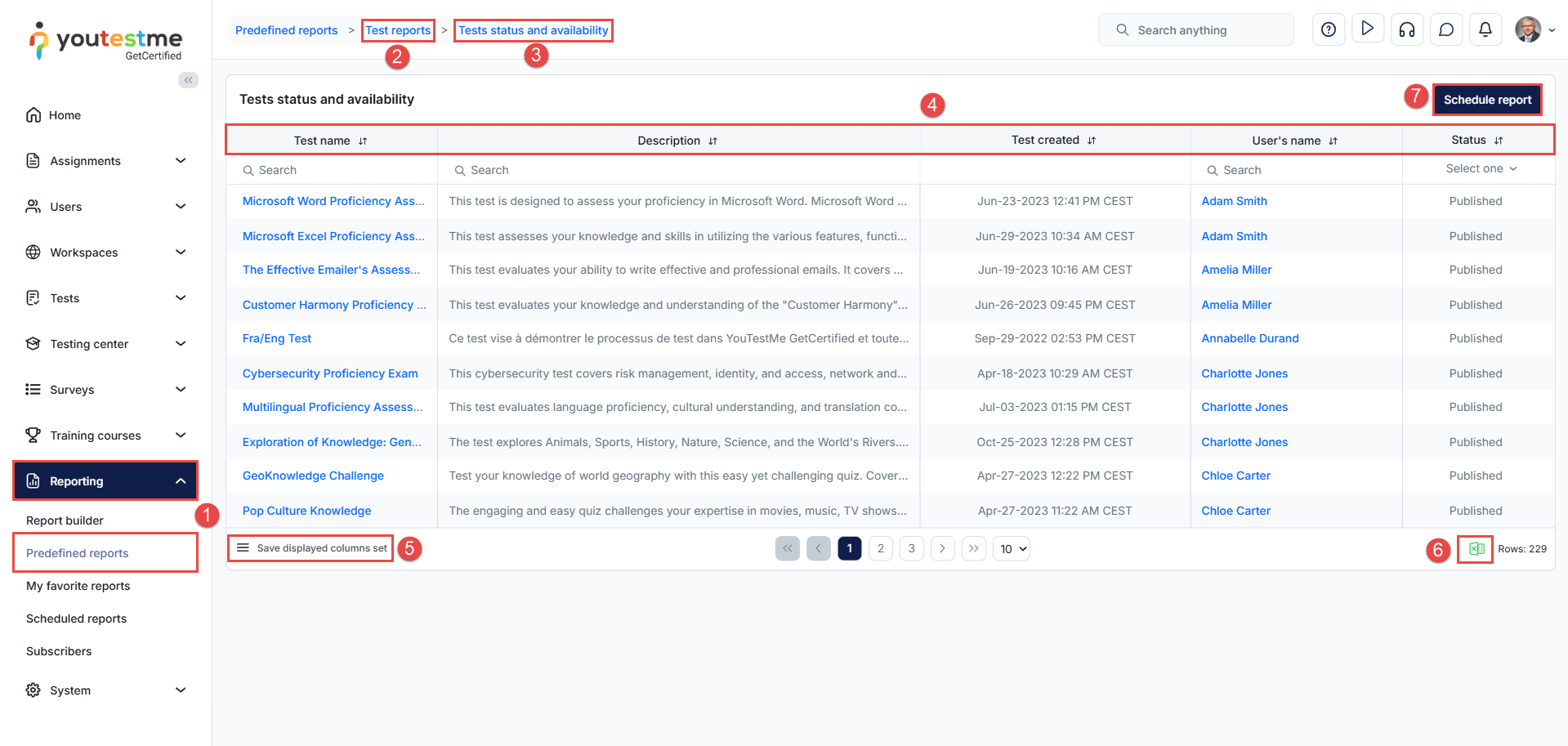 The Test statuses and availability report gives you full visibility into all tests across the system, helping ensure that each test is up-to-date, properly published, and ready to be used in testing sessions. By customizing the displayed columns, exporting the data, or scheduling periodic updates, you can streamline your administrative workflow and maintain complete control over your test inventory.