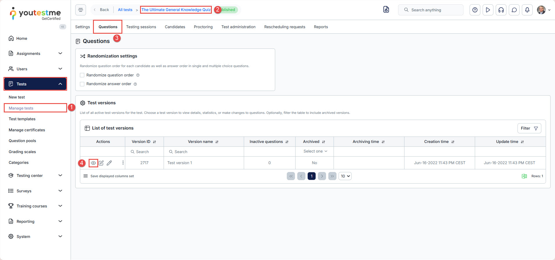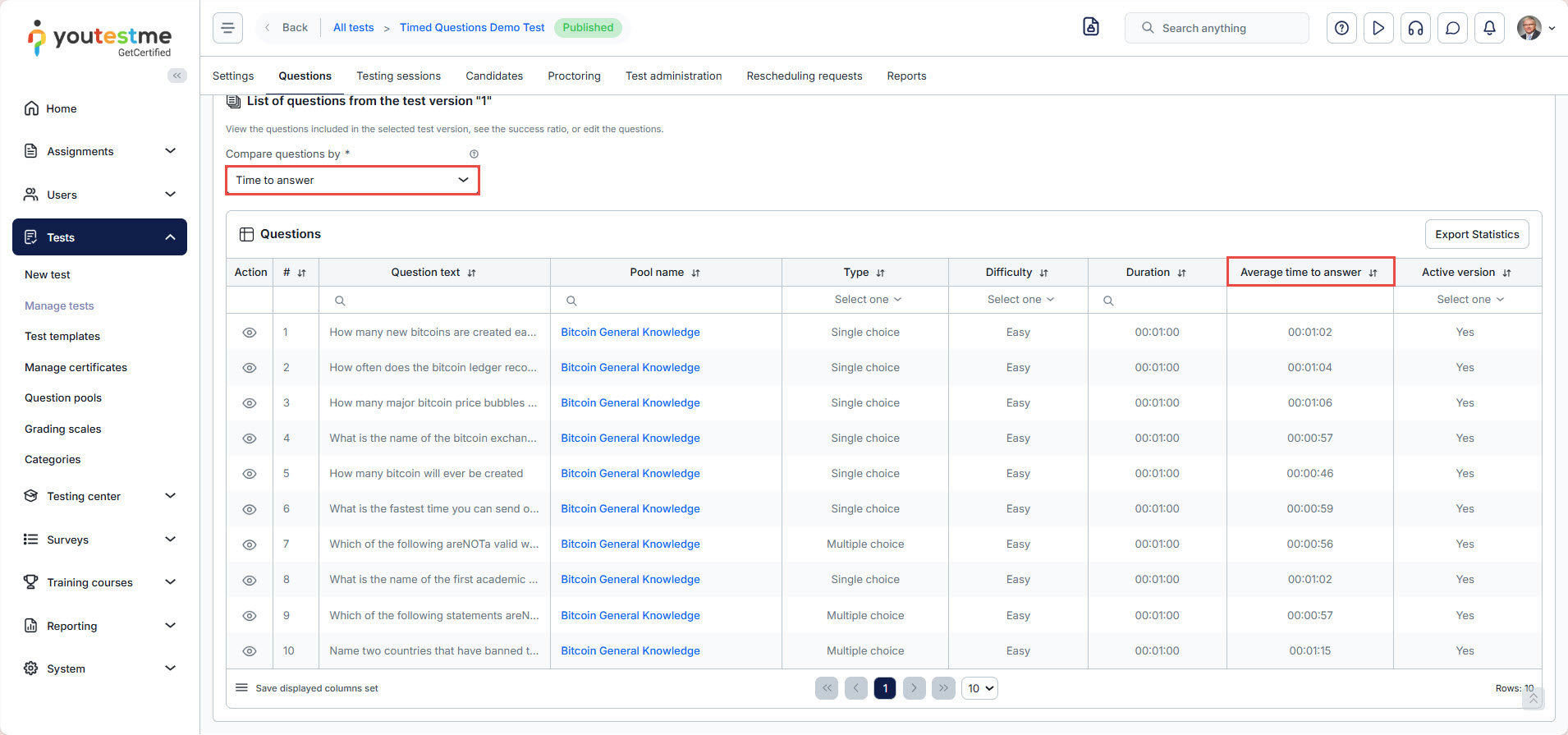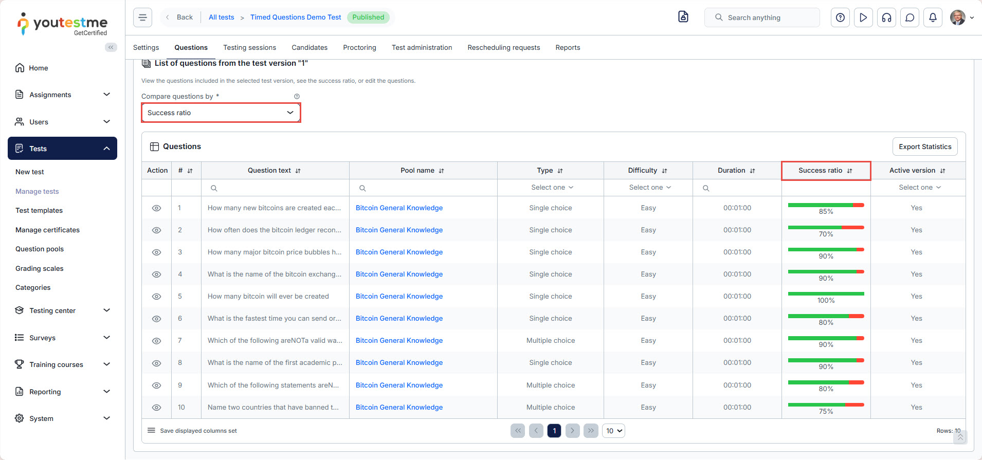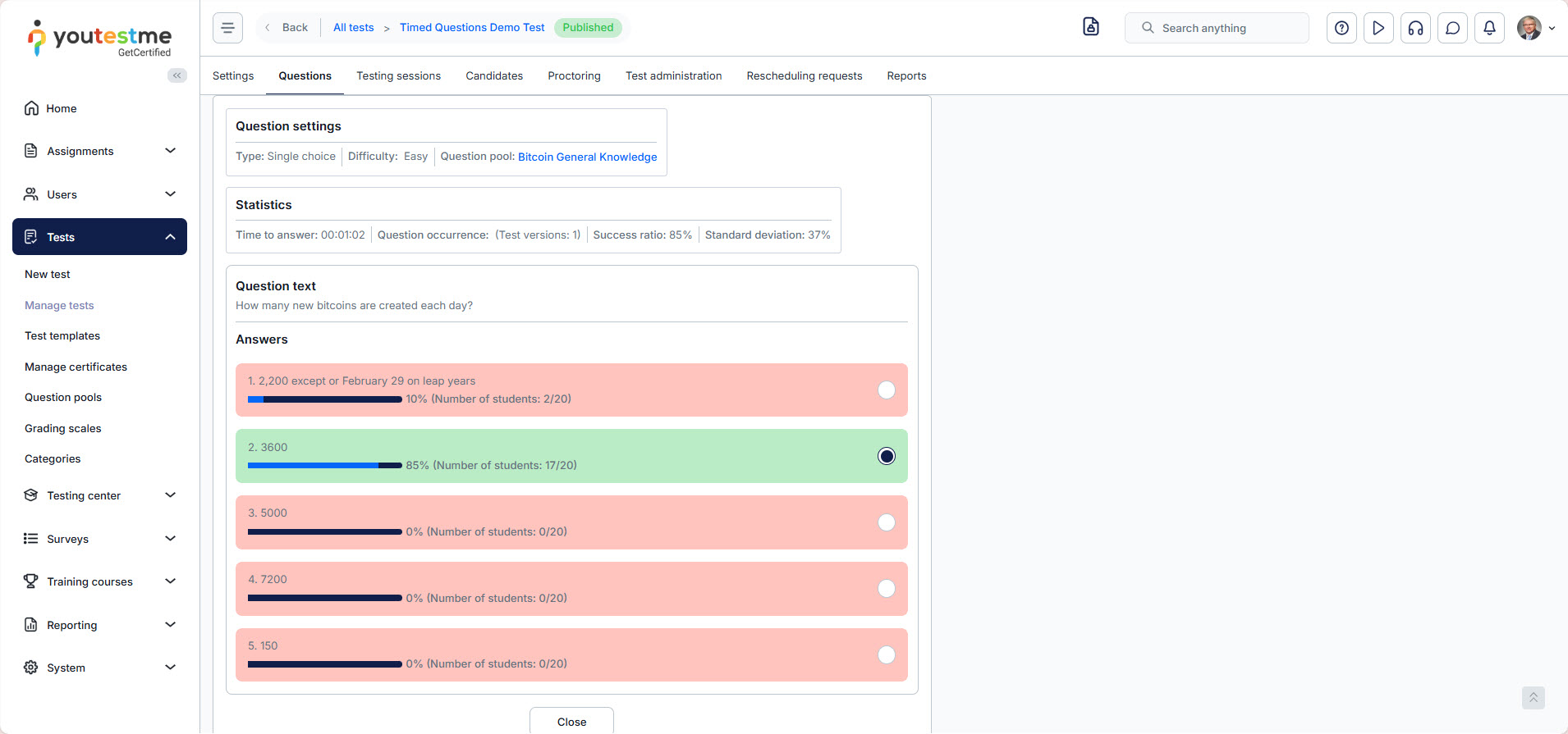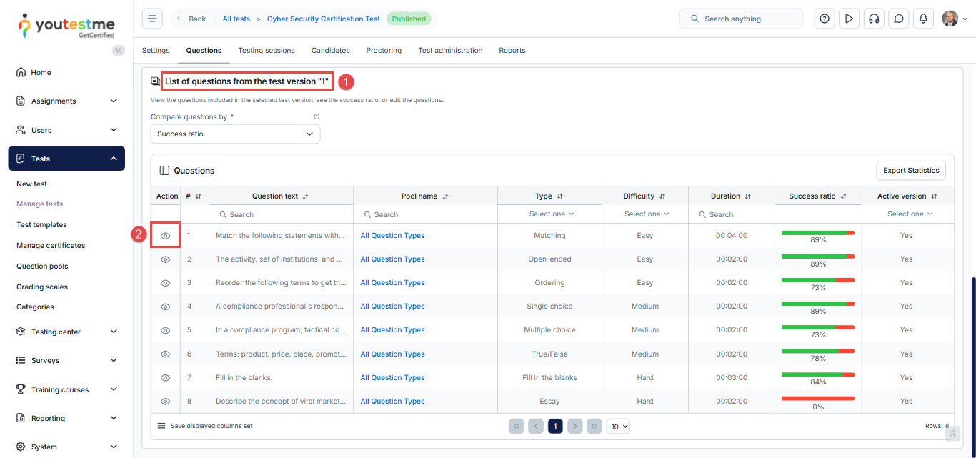 - Statistics on Question Level – Within YouTestMe GetCertified, you have access to detailed statistics at the question level. This feature allows you to evaluate the performance, difficulty, and effectiveness of each question in a test.