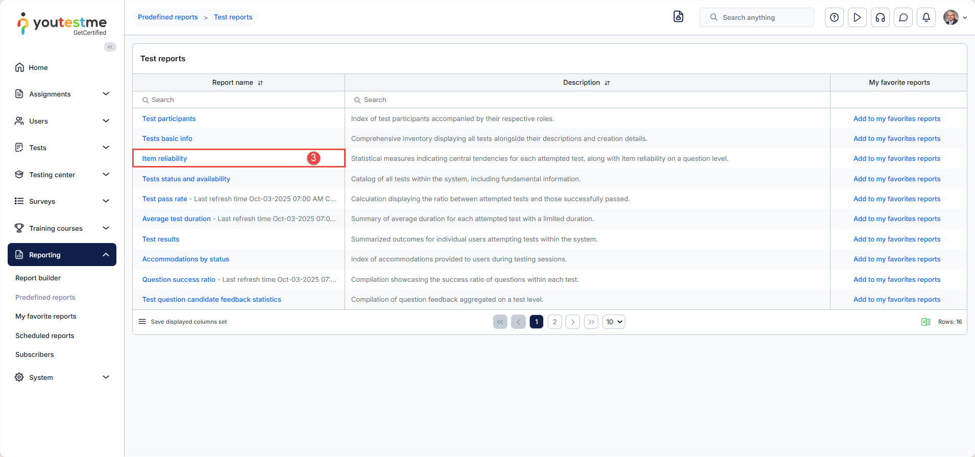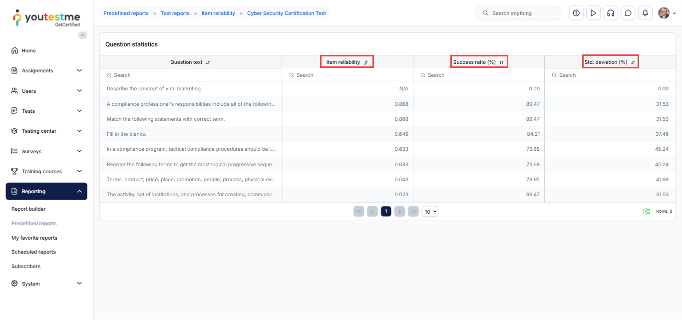 - Predefined Test Report – You can utilize the item reliability report provided by YouTestMe GetCertified. This report offers insights into the performance of each test question, allowing you to assess the reliability and effectiveness of the items.