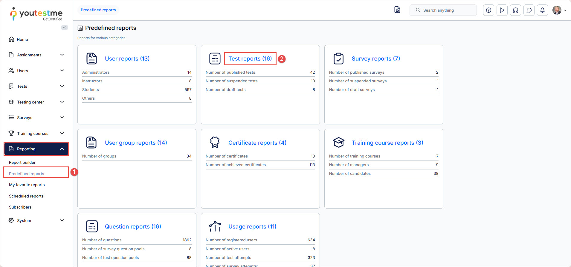 - Click the Reporting option in the main menu, and select Predefined Reports.