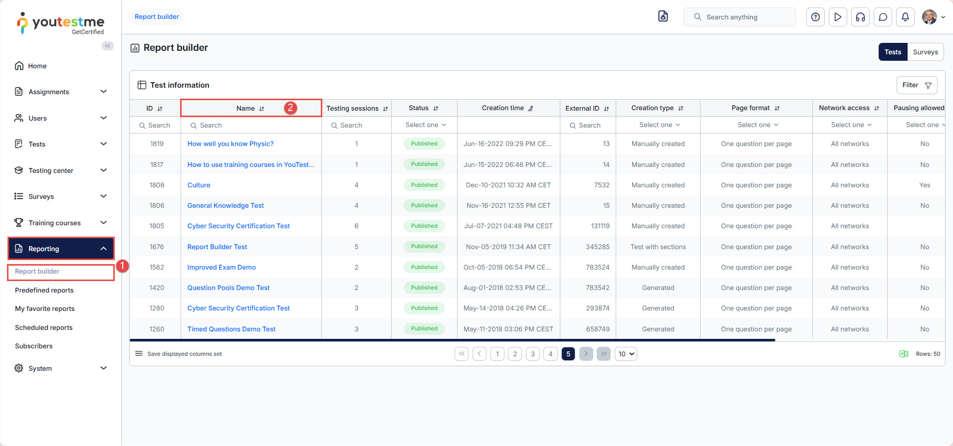 - Select the test using the Name column or ID to display a Report Builder for a specific test.