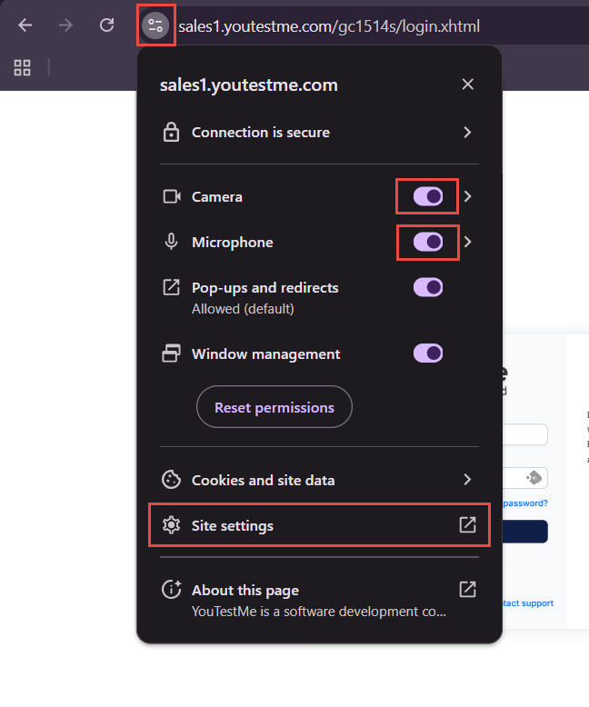 - Navigate to the exam page that requires camera or microphone access.