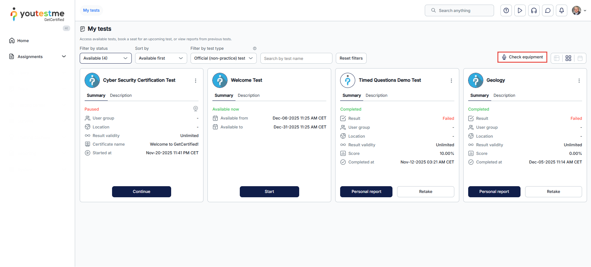 Before your exam, you can check your equipment using the Check Equipment button available on the My tests page. The equipment check ensures your webcam, microphone, screen sharing, and network are working properly. If any issues are detected, the system will notify you.