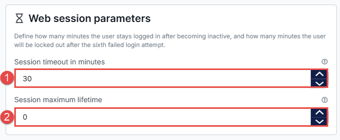 The Web Session Parameters section allows administrators to define how long a user session remains active and when reauthentication is required.