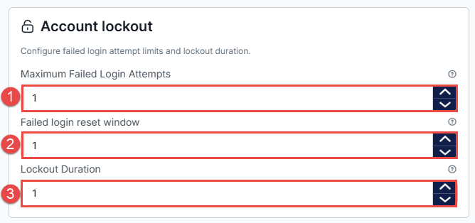 - Lockout Duration – Defines how long the account remains locked (in minutes) after too many failed login attempts.