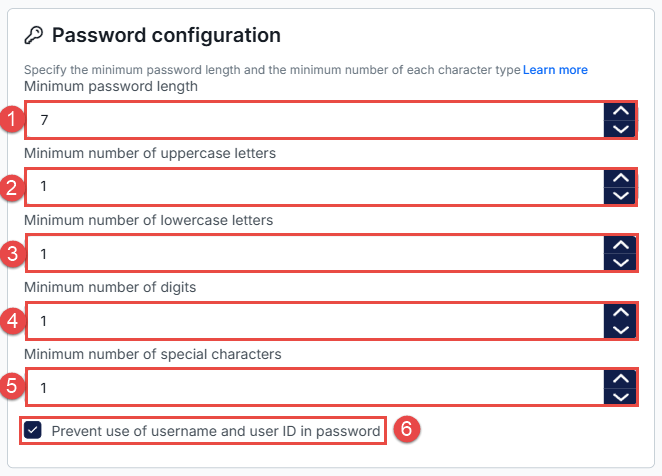 The Password Configuration section defines password complexity requirements to ensure stronger account security.