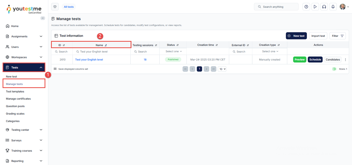 1. From the main menu, navigate to the Tests section and select Manage tests.