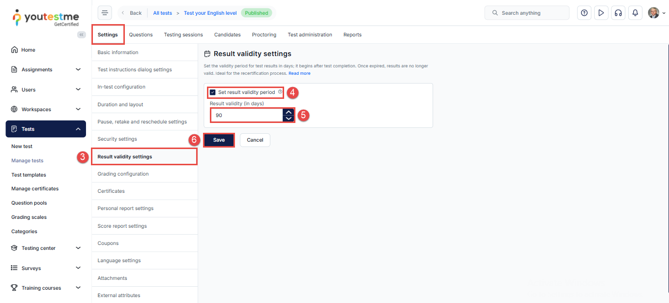 3. Enter the Result validity period (in days). Results remain valid for this period, starting from the date of exam submission.