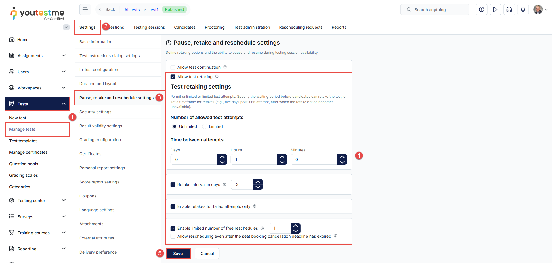 - Define a timeframe within which students can retake the test. For instance, if set to 2 days, retakes can only occur within the following 2 days after the initial attempt.