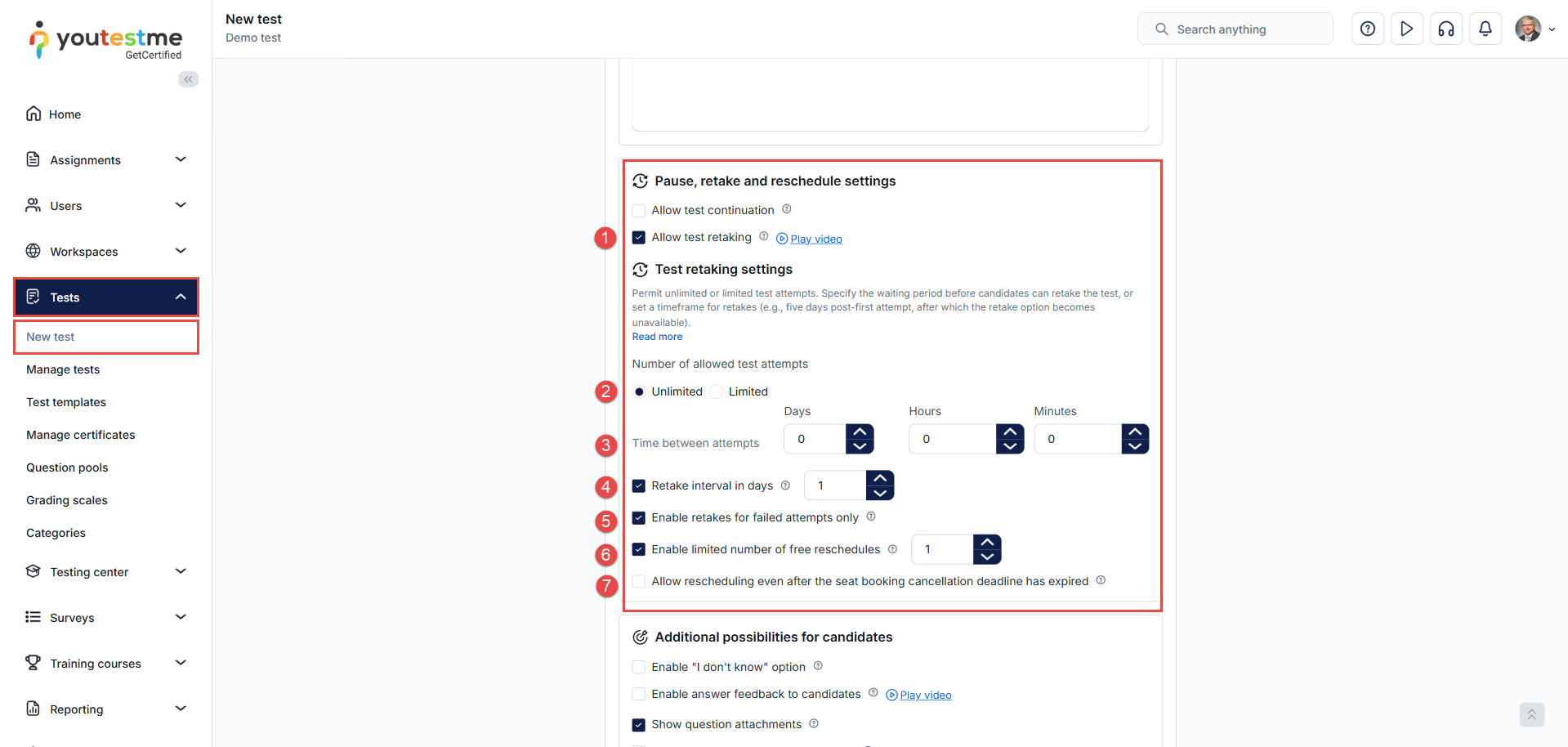 - Choose between allowing unlimited test retakes or limiting the number of attempts.