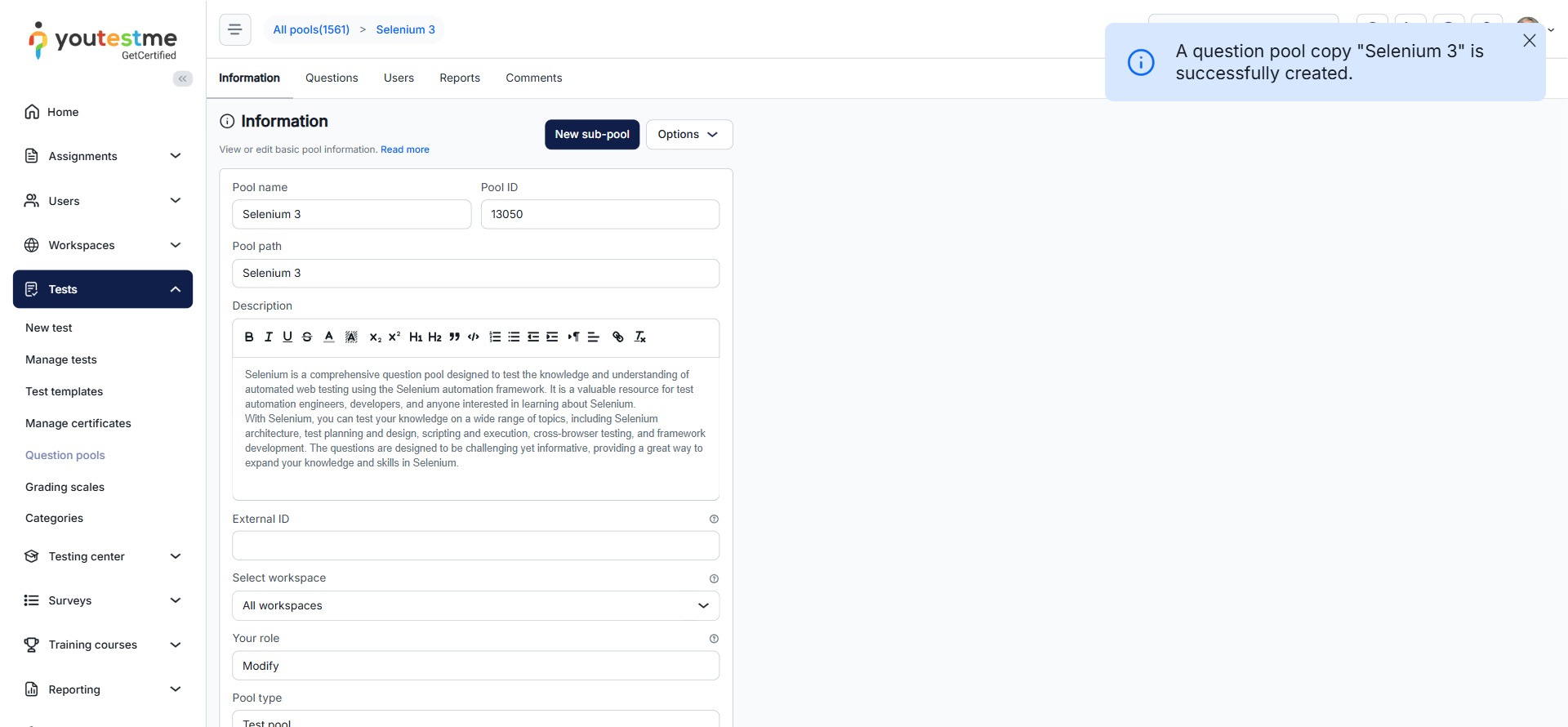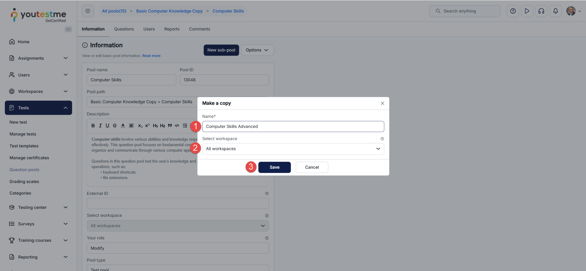 This article explains the process of creating a copy of an existing question pool. Copying a pool allows you to reuse its structure and content, making it easier to manage and adapt assessments without starting from scratch.