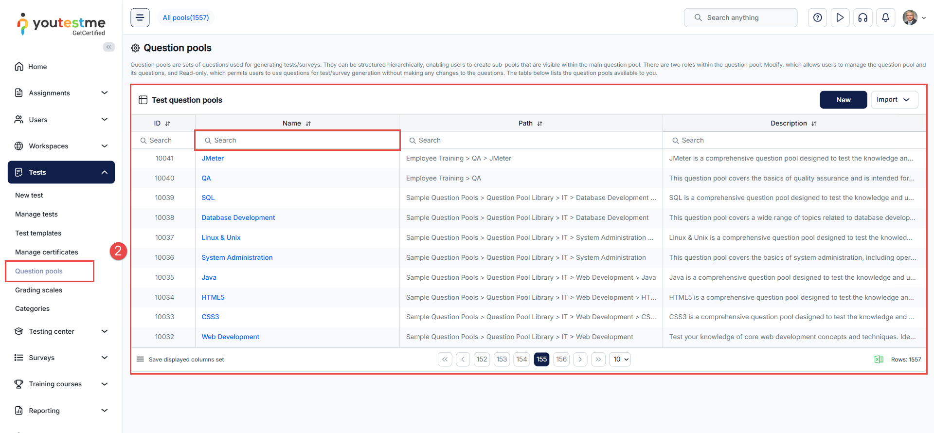 - From the table – use the search option in the table that lists all available question pools to find the pool by name.