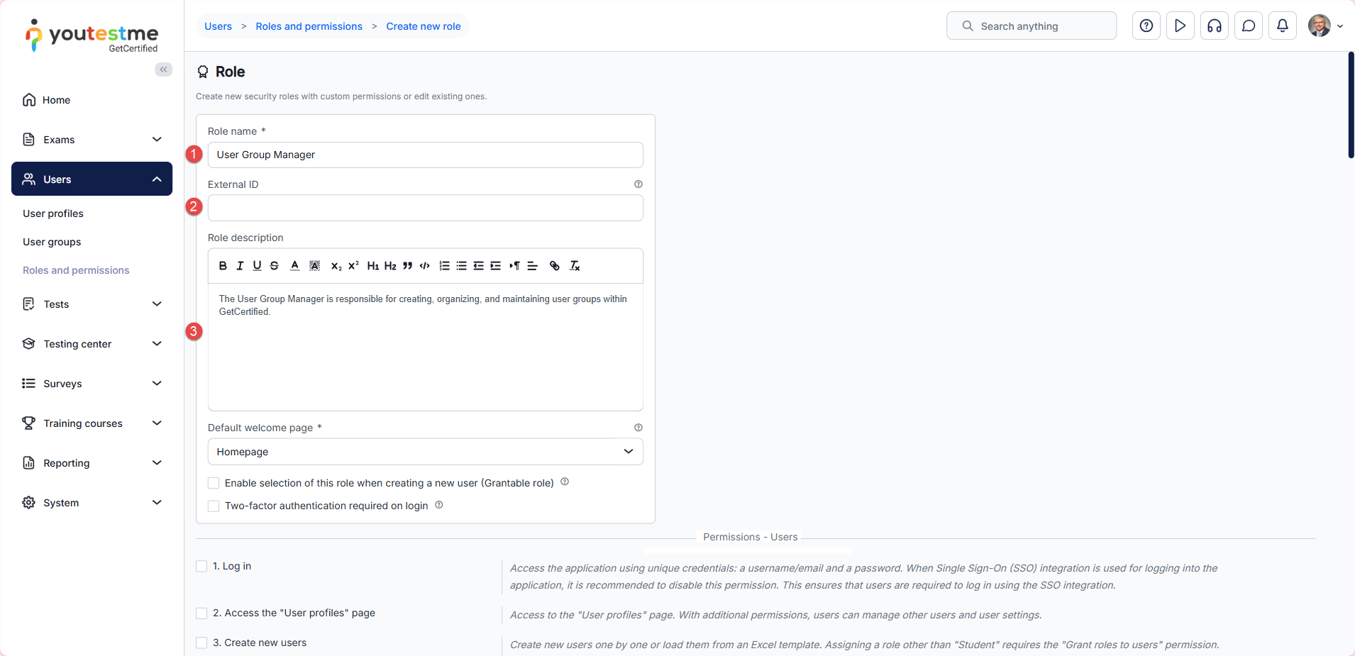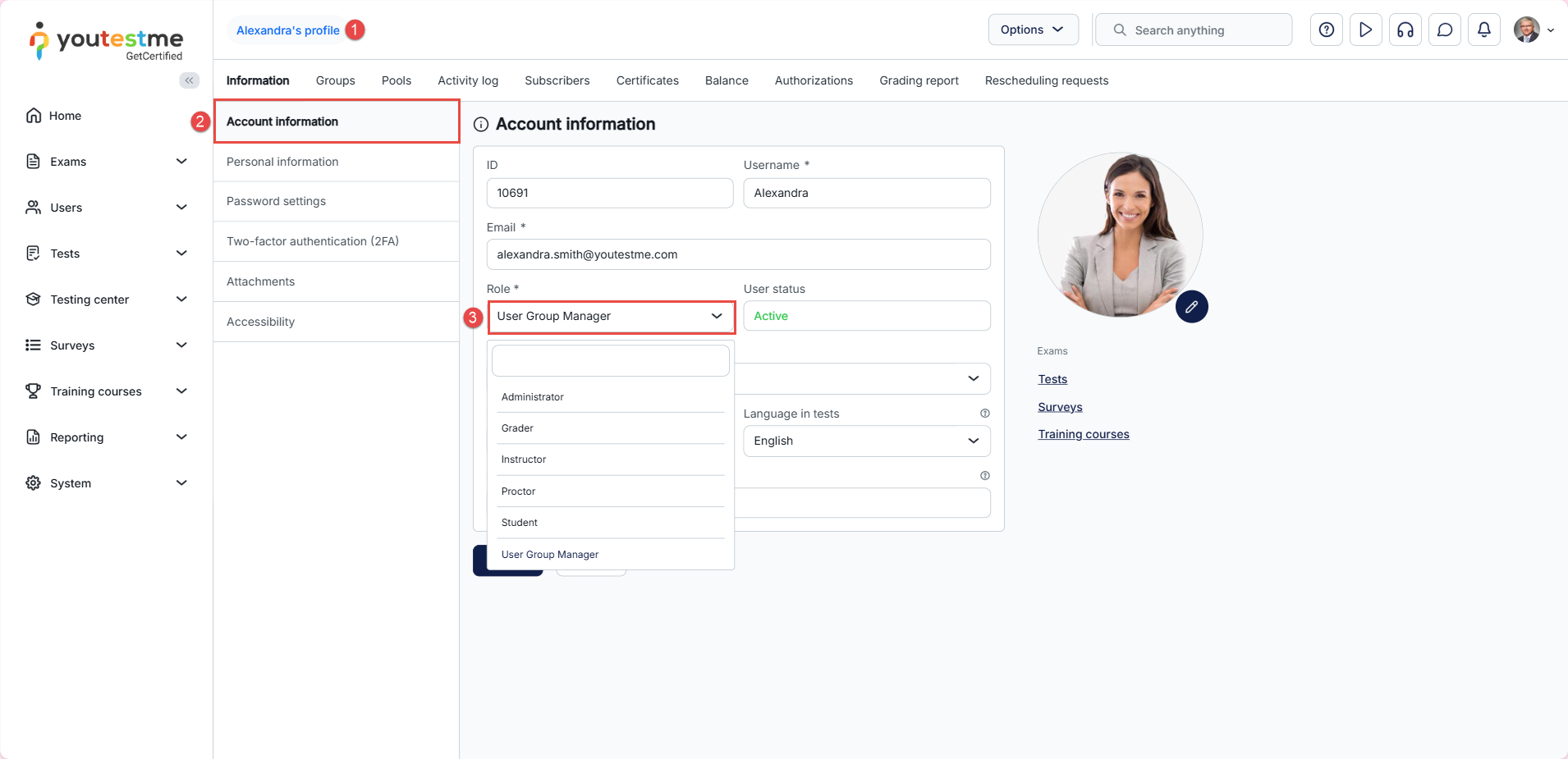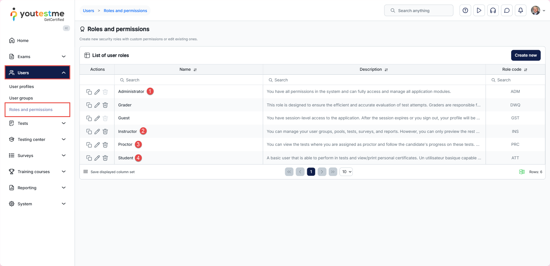 - Instructor – A role with higher-level permissions than a regular user, instructors can manage their groups, question pools, tests, and reports, while only previewing the content not managed by them.