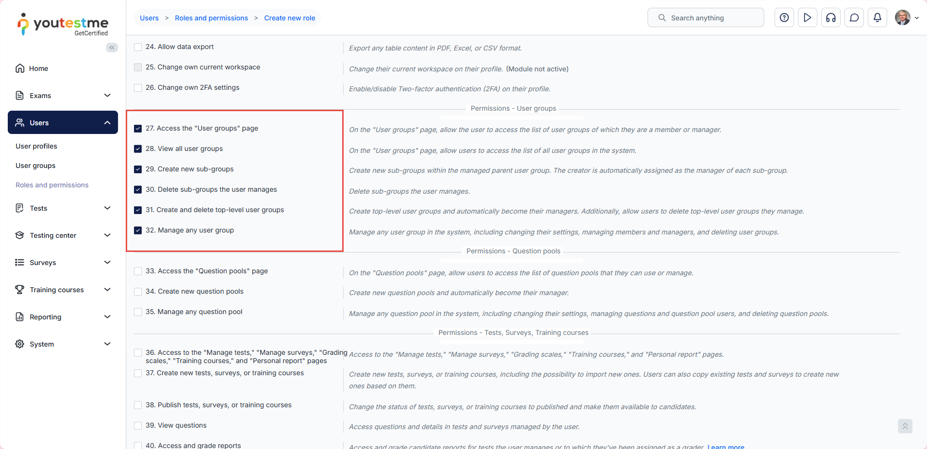- Select the permissions you want the group manager to have. We suggest choosing permissions from 27 to 32. Permission 1 is selected by default.
