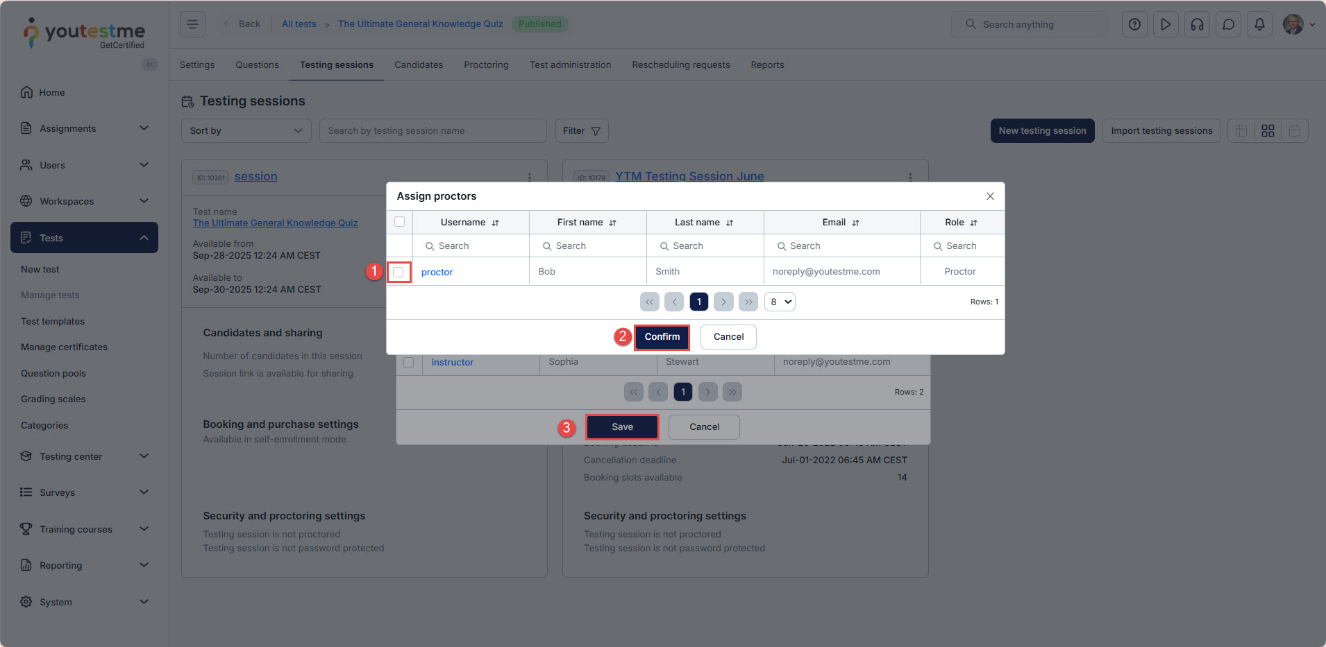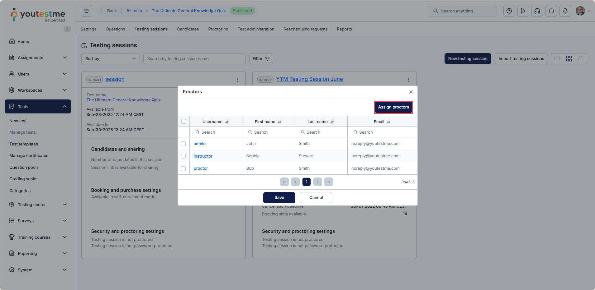 Whether it’s a live proctored exam or an AI-proctored exam, assigning proctors is required. This ensures that the user with the proctor role can either monitor the live exam or access the exam recording and generate the proctoring report.