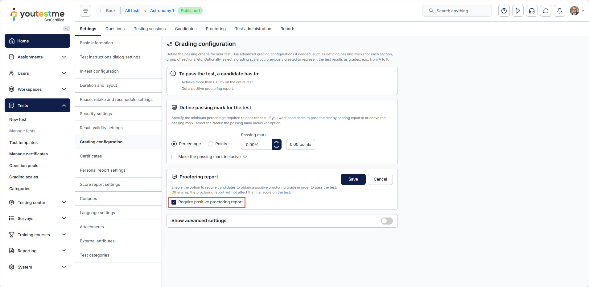 For an Existing Exam, navigate to the Grading configuration tab under the test settings and enable the “Require Positive Proctoring Report” option.