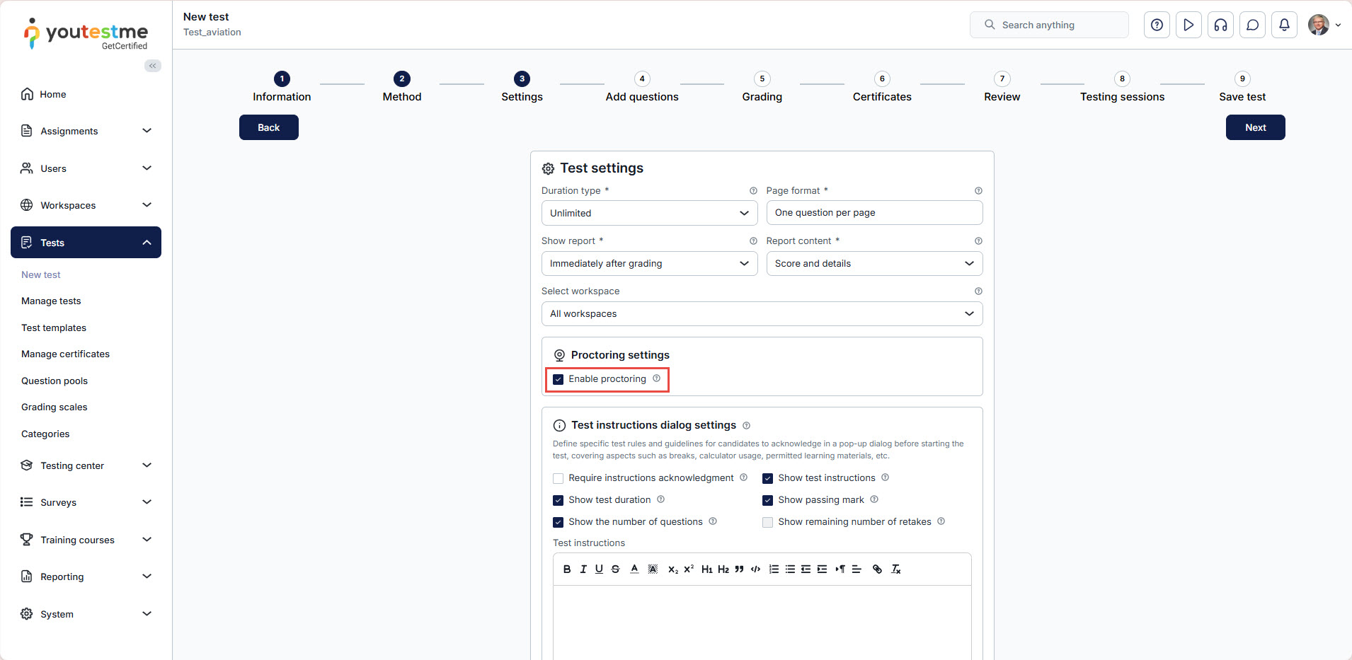 Proctoring can be activated while creating a test during the “Settings” step in the test creation wizard. To enable it, simply check the “Enable Proctoring” option within the proctoring settings section.