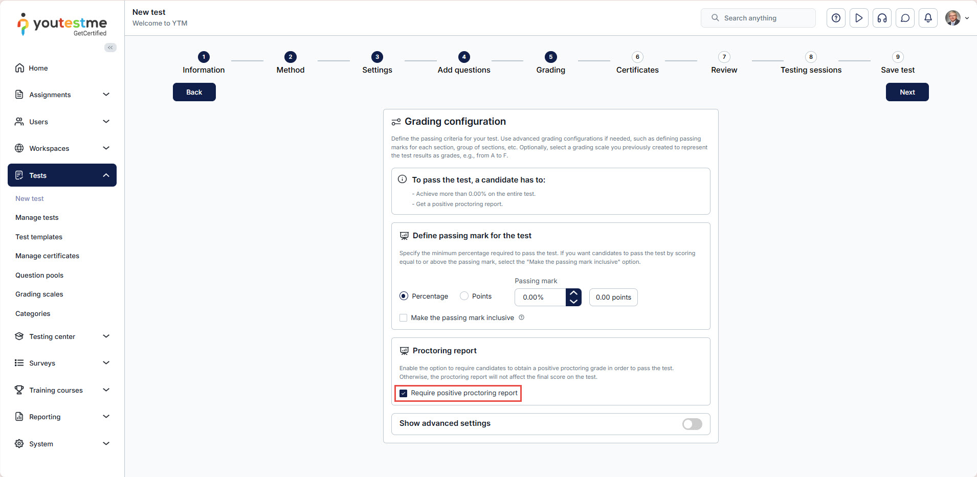 To enable this feature during Exam Creation, check the box next to “Require Positive Proctoring Report” at the Grading step of the exam creation process.