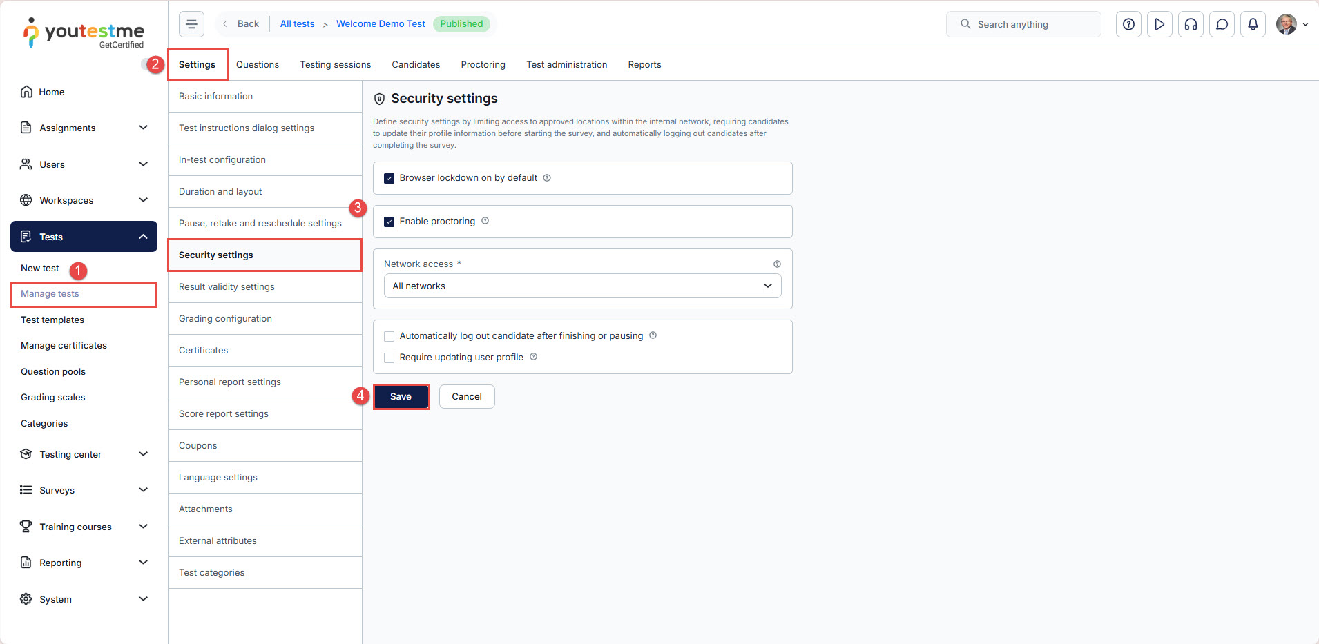 To set up a proctored exam, you need to activate the proctoring security feature either in the test settings or the session settings.