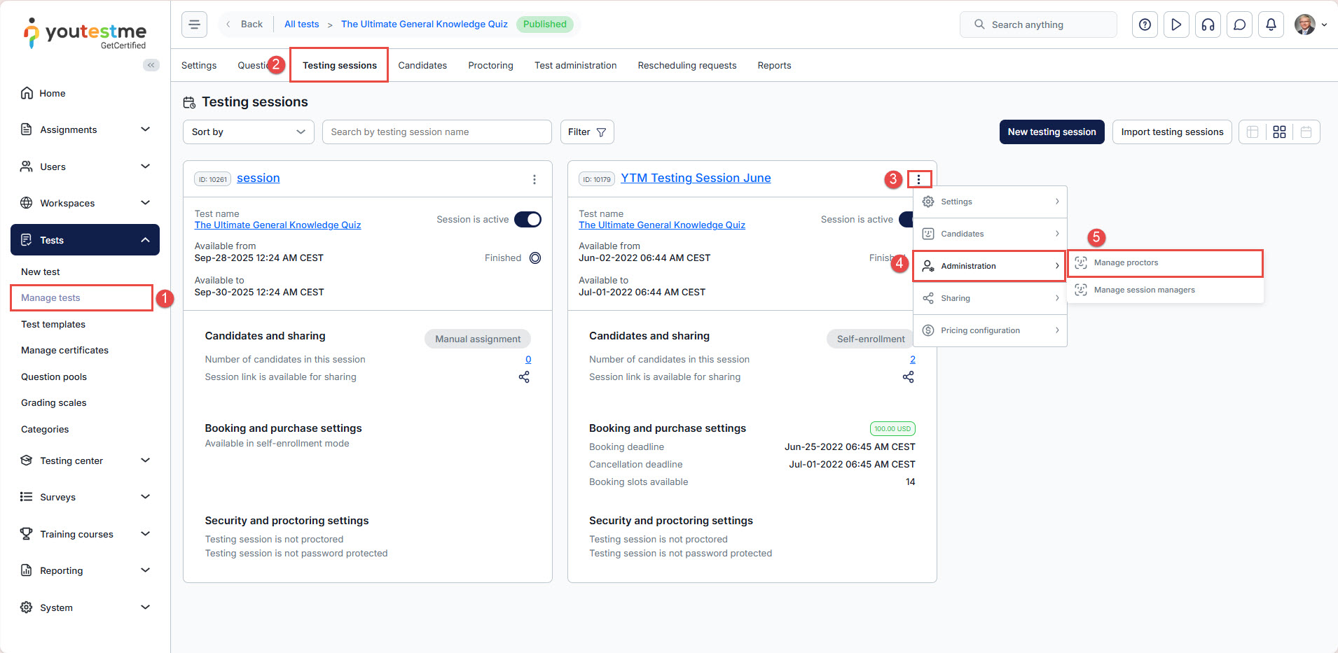 2. Select the desired test and navigate to the Testing Sessions tab.