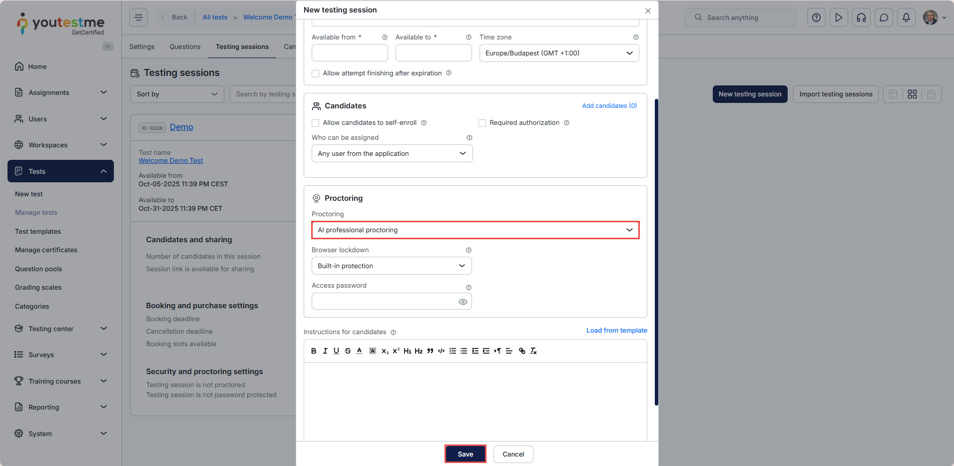 To enable proctoring for a specific session, fill in the necessary details, navigate to the Proctoring section in the session creation dialog, choose “AI professional proctoring” from the drop-down menu, and click the “Save” button to apply the settings. Please refer to the following article for more information about session creation settings.