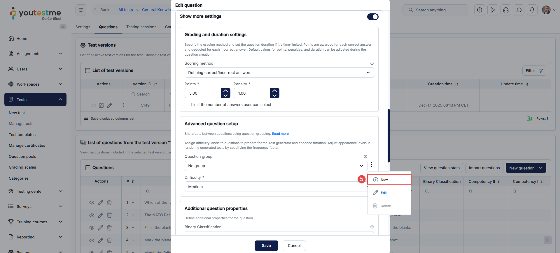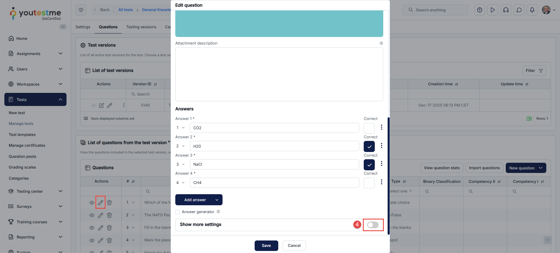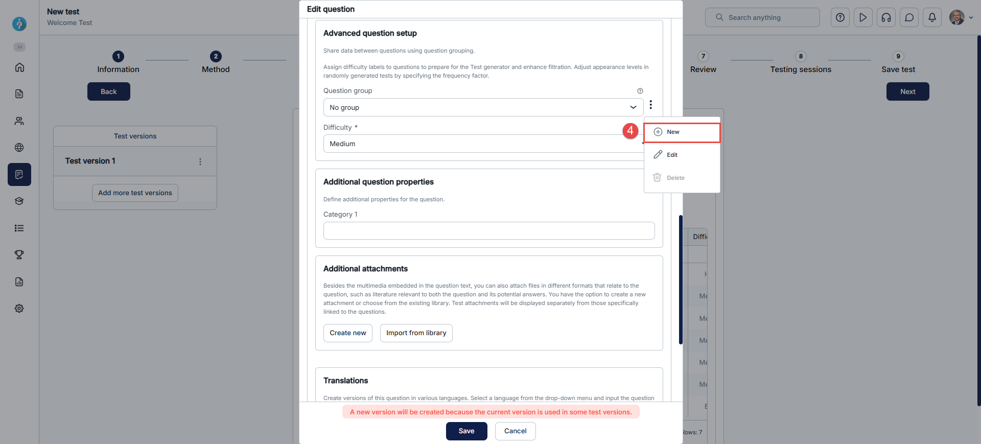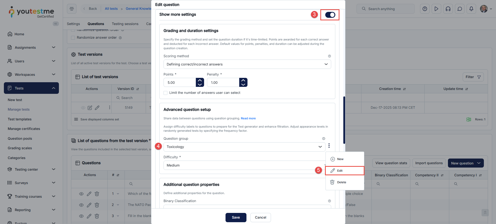 First, open the desired question in the fourth step of the test creation wizard by clicking the vertical three dots icon, and then click the Edit.