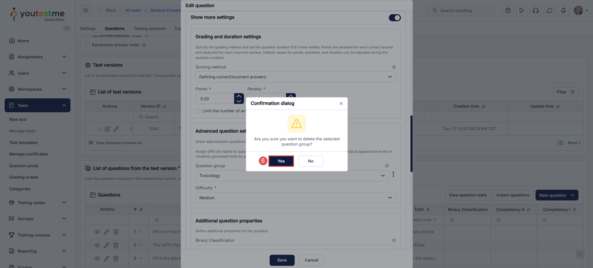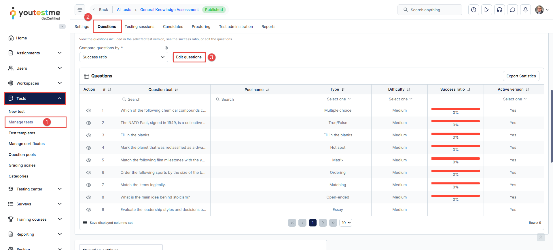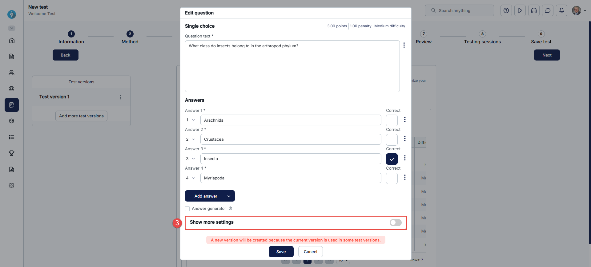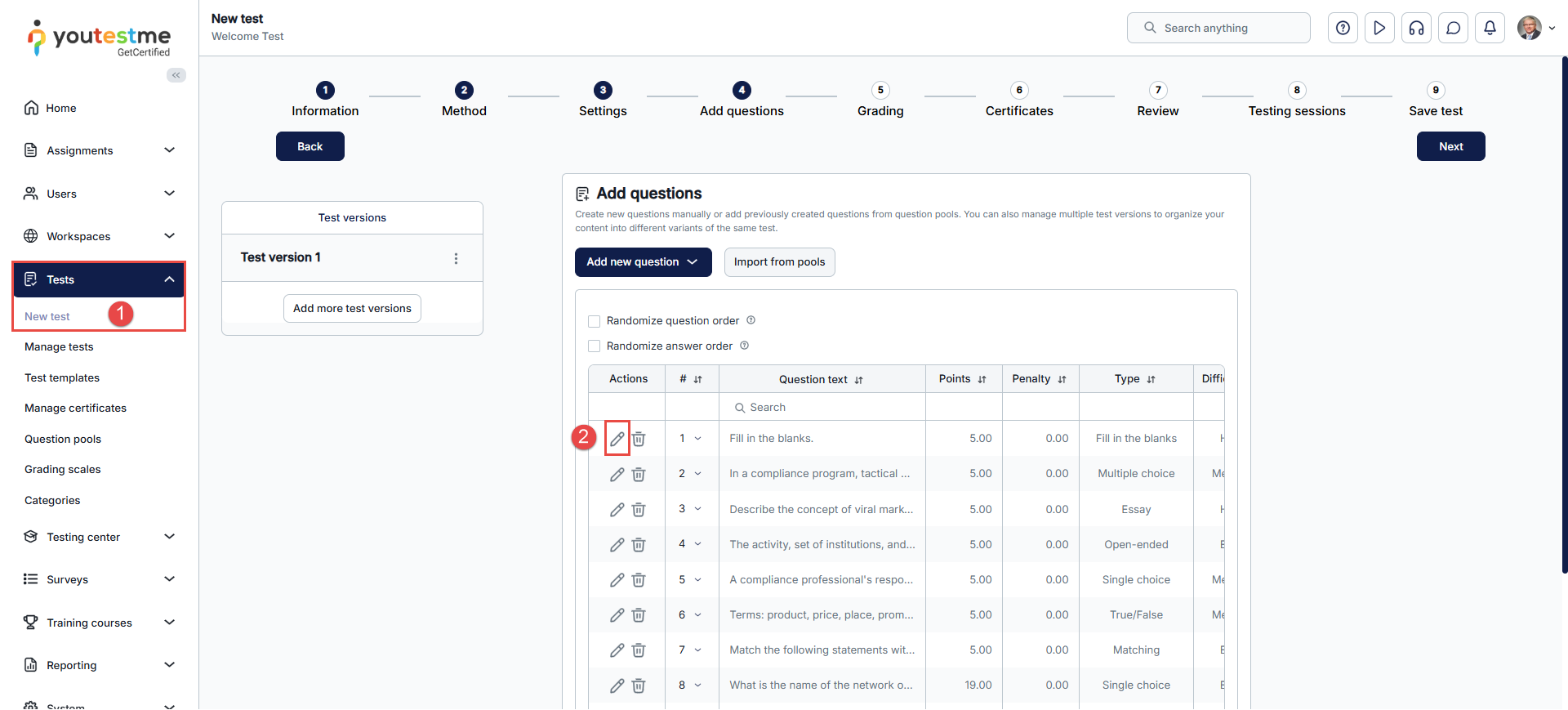 First, open the desired question in the fourth step of the test creation wizard by clicking the vertical three dots icon, and then click the Edit.