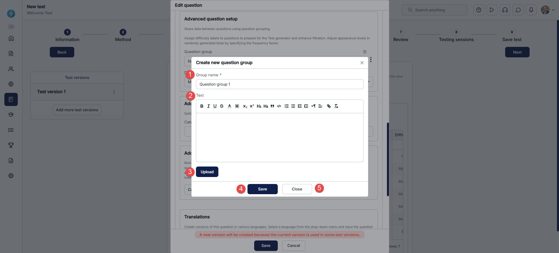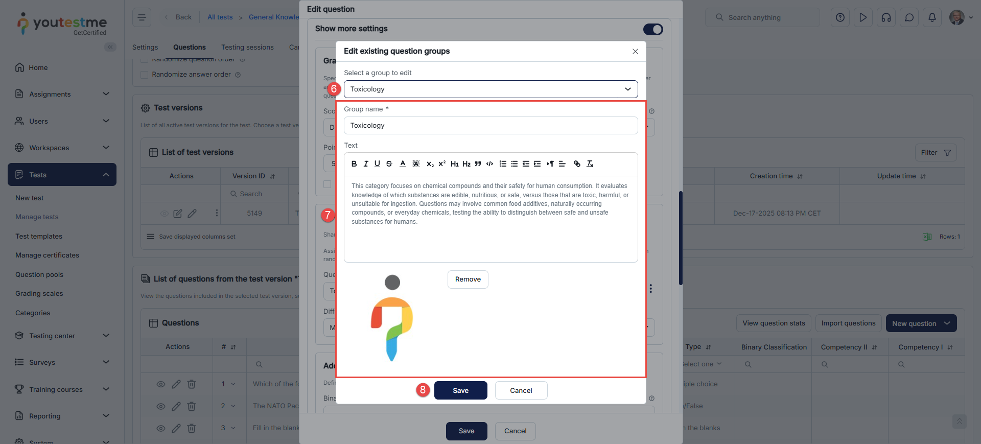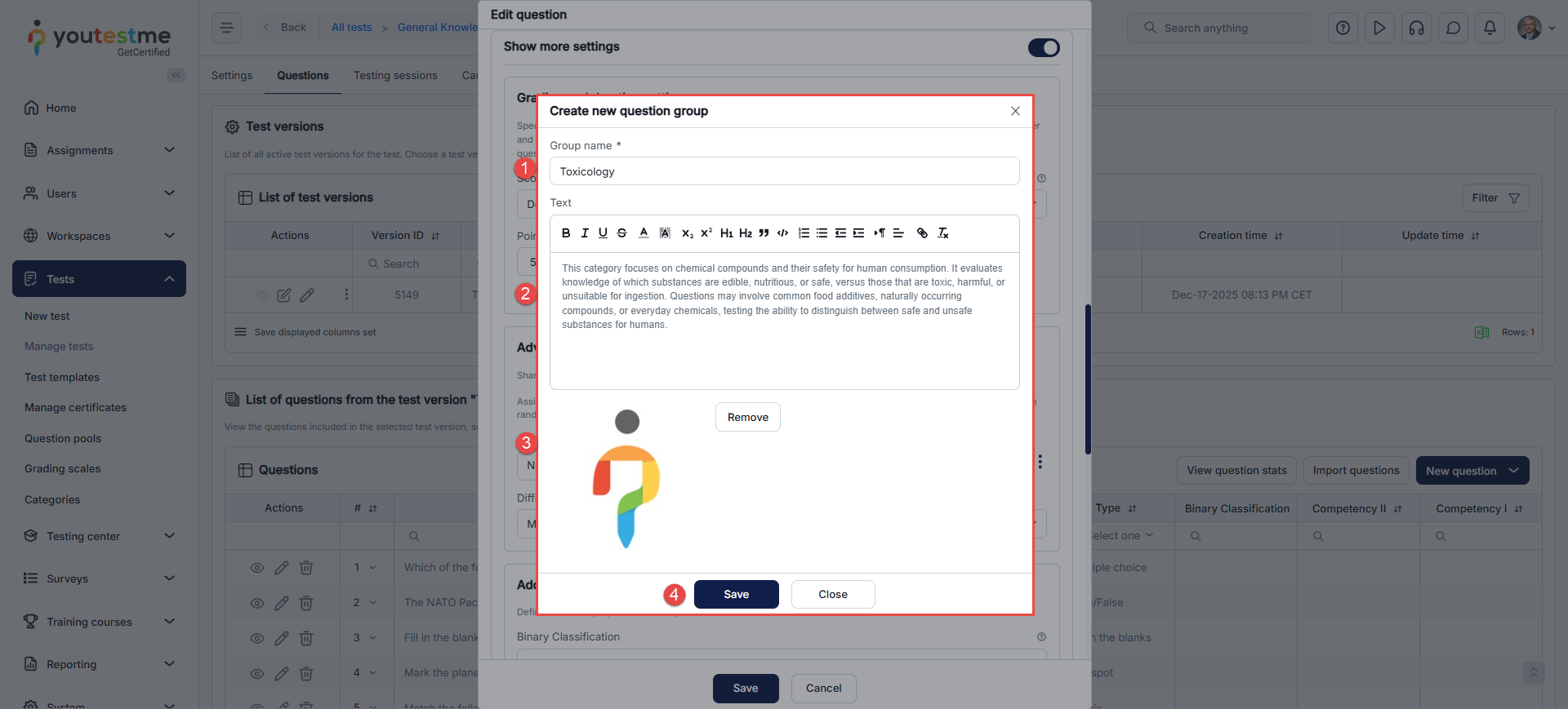 Once you add the questions you want to be in the test via Add questions tab, you can assign an appropriate group to each of them. The question group allows you to organize multiple questions into a group and add its short description and multimedia (image, audio, video), displayed with each question within the group.