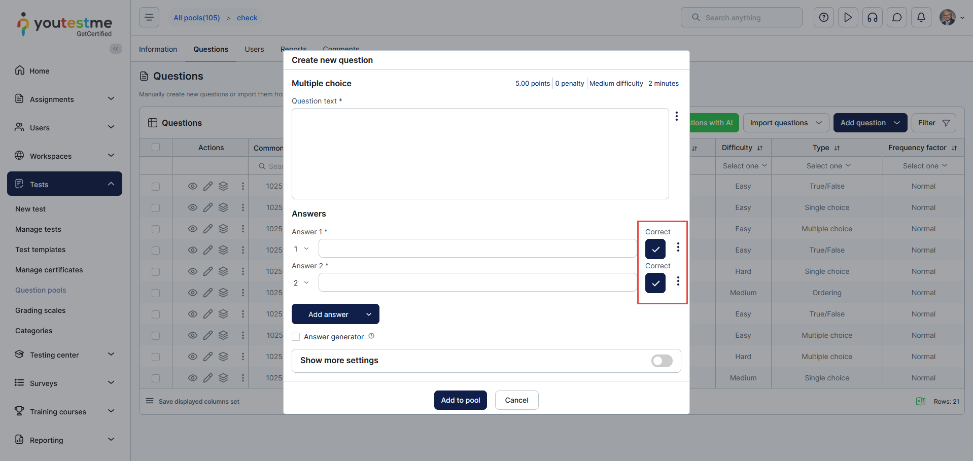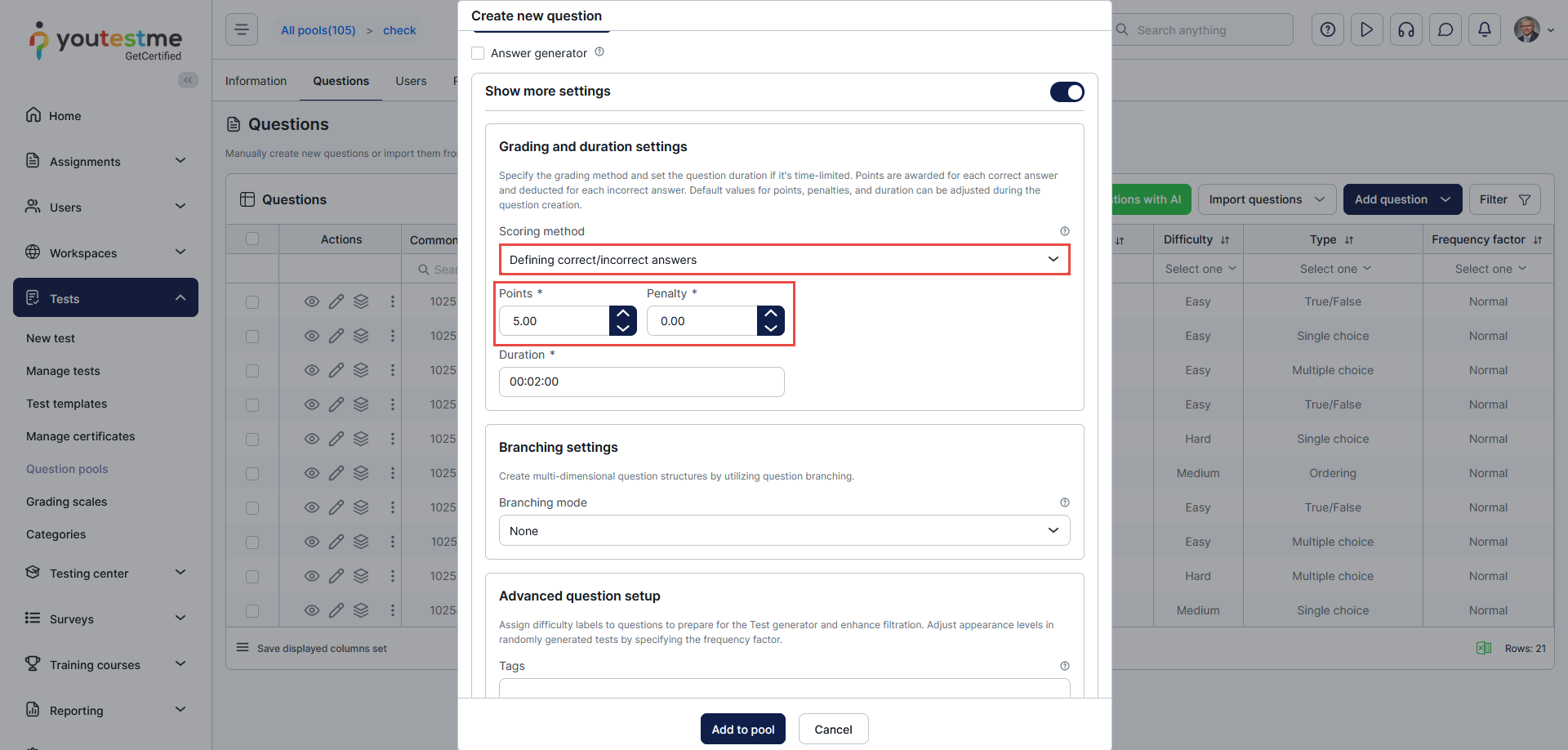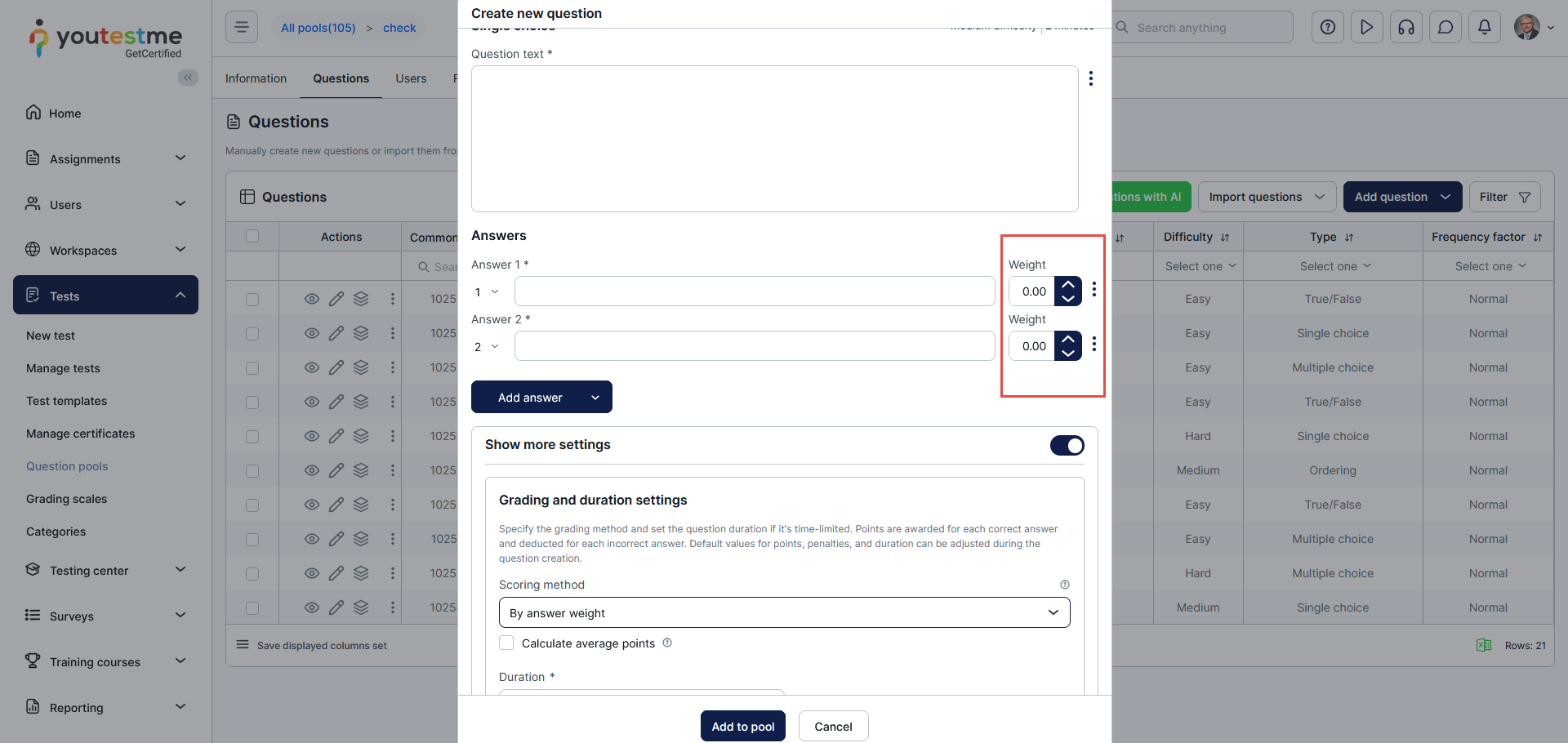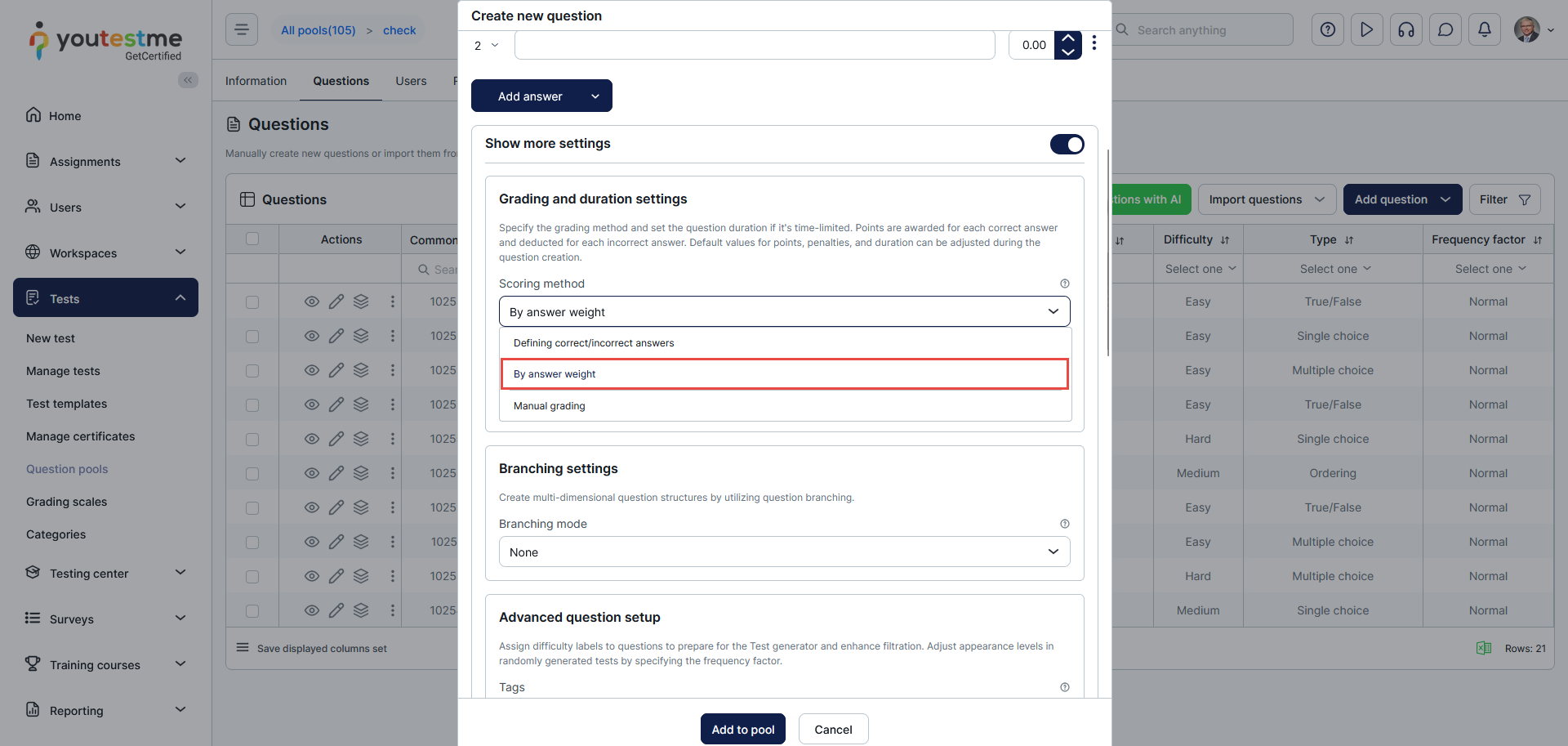 To create a demographic section, first, you need to create questions that carry 0 points. You can do this by selecting the Scoring method: “By answer weight” or “Defining correct/incorrect answers“, and setting the values to 0. This will allow you to collect data about the candidates without the answers affecting the final test result (for more information on creating each question type, please visit our support web page, and find an appropriate article).