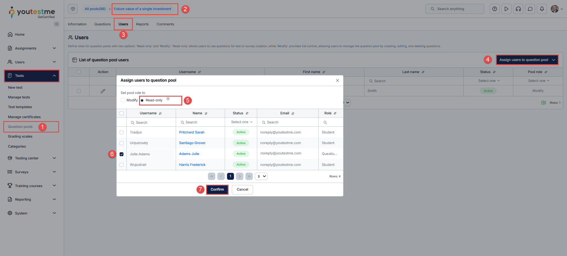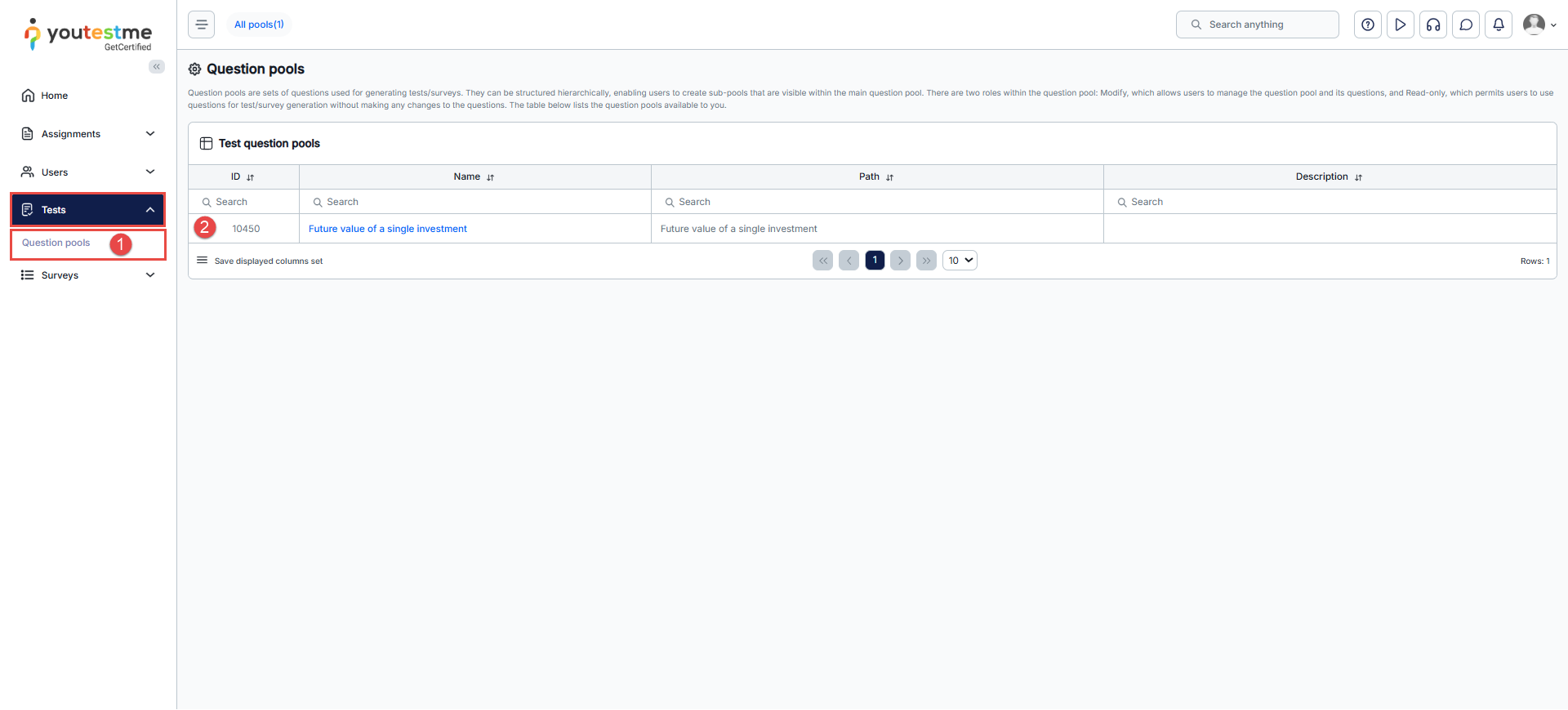 - Click on the specific question pool to which you want to grant read-only access for a user.