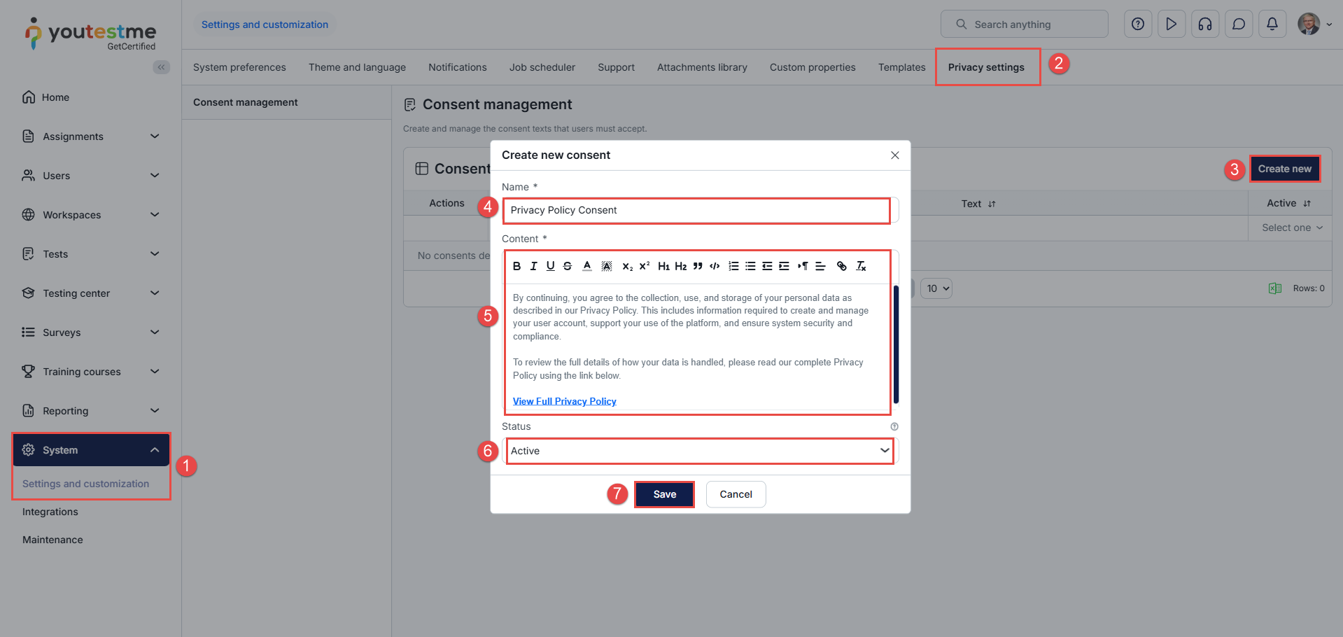 In this article, you will learn how to create and manage user consents that appear to candidates during registration and login. These consents help organizations enforce important policies, such as privacy, security, and terms of use, before users access the system.