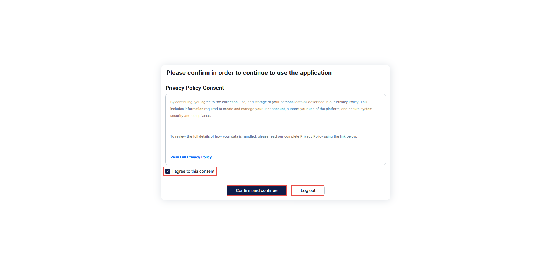 If the user agrees, they can proceed into the system by selecting Confirm and continue.