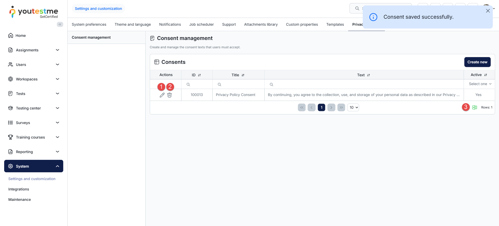 Once the consent is saved, it appears in the table on the same page. From here, you can: