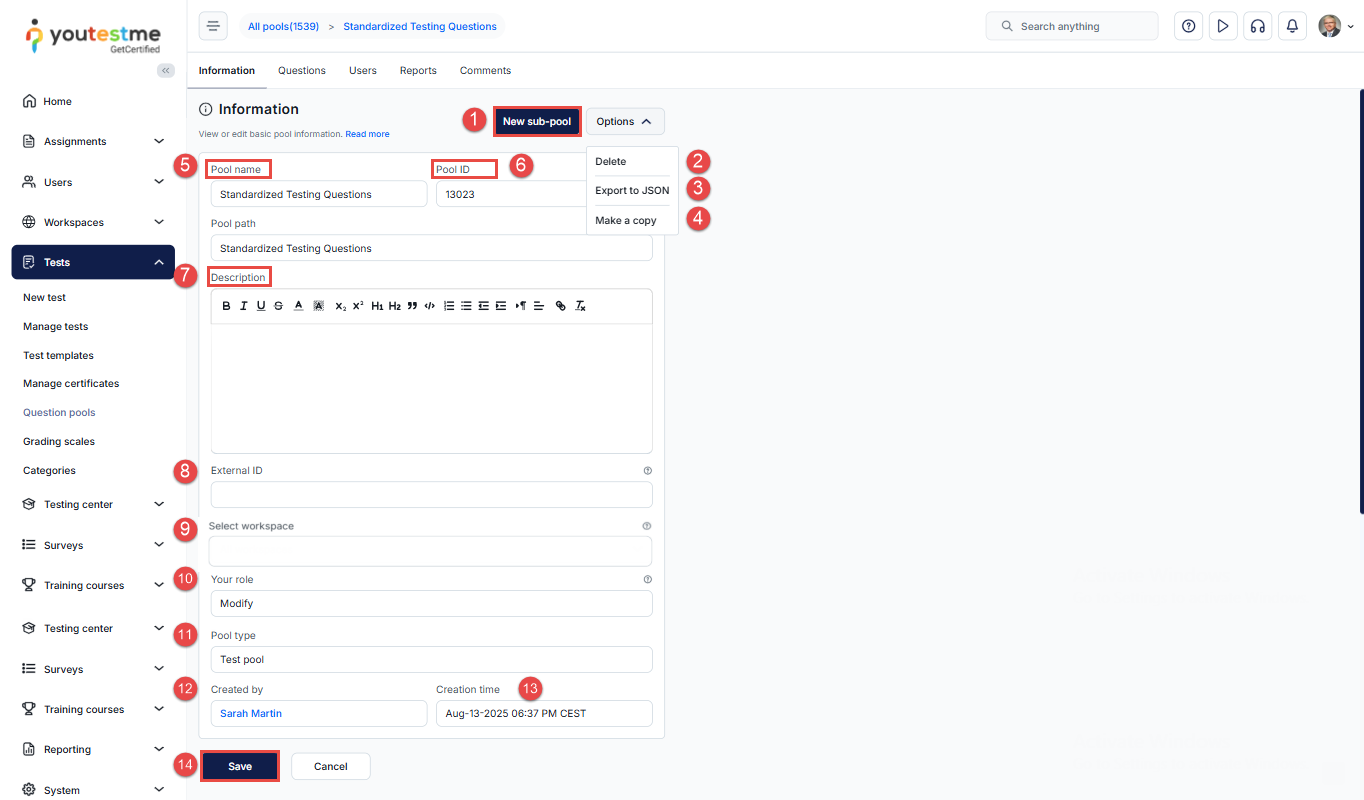 Once the question pool is created, you will be redirected to the Information tab, where you can view and edit the following information: