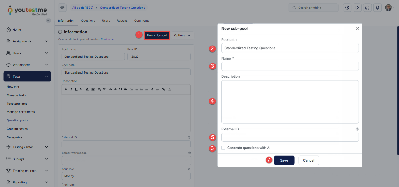 - Create a New Sub-Pool – A pop-up window will open with the same fields as when creating a question pool. Fill it out to create the sub-pool.