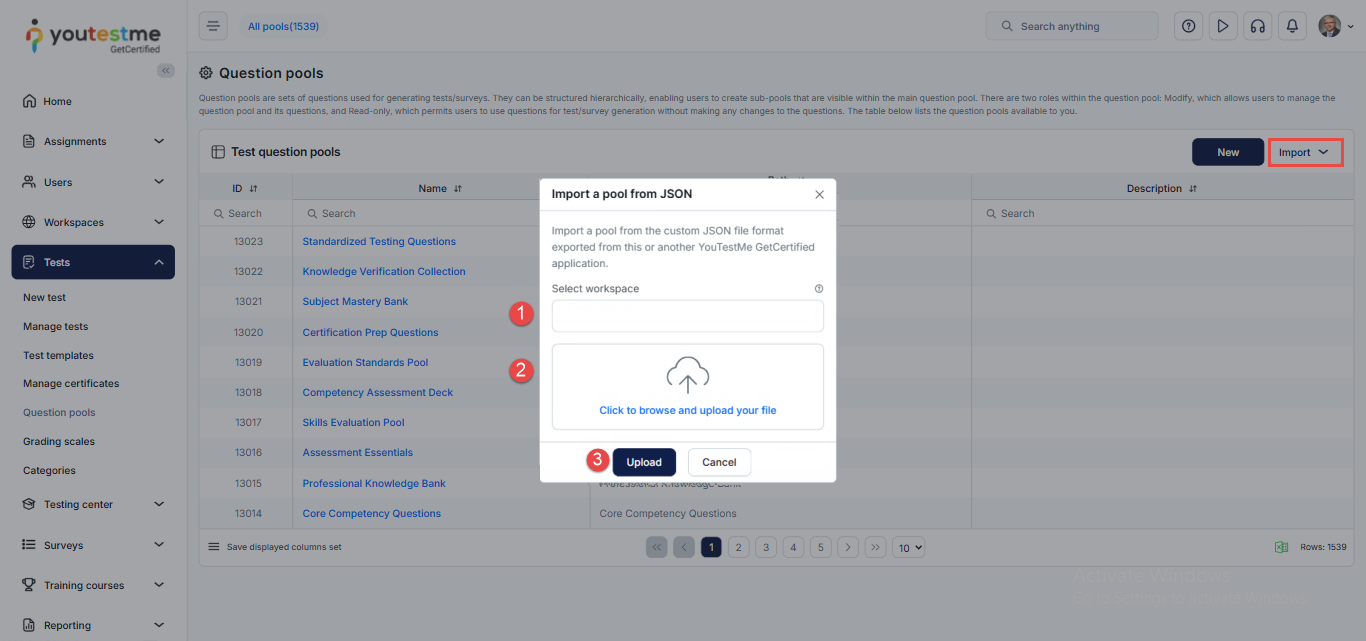 - Alternatively, click the Import button to upload question pools from JSON or Excel files.