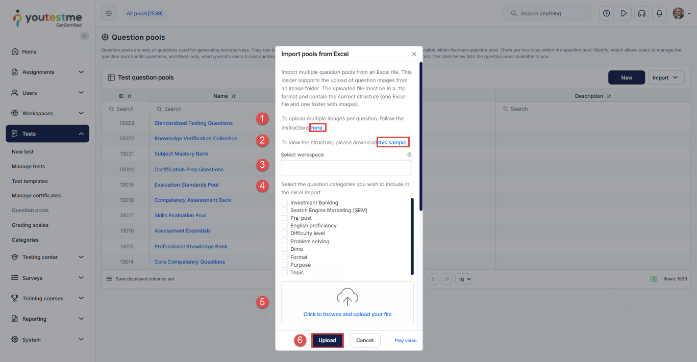 To import a question pool using the YouTestMe Excel template, follow these steps: