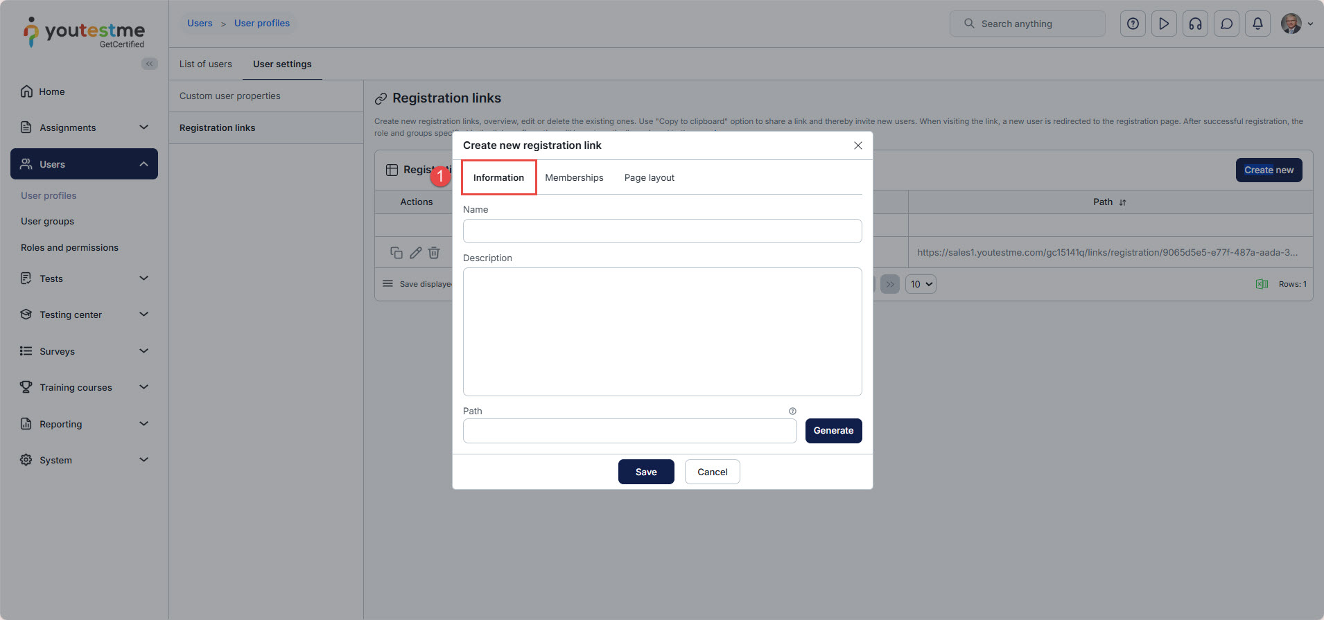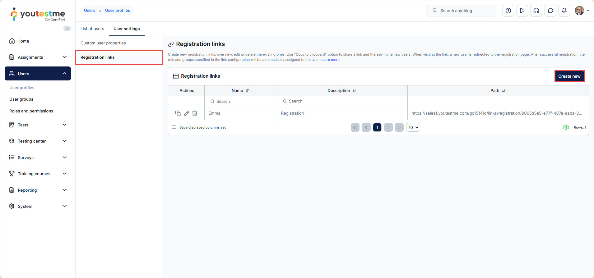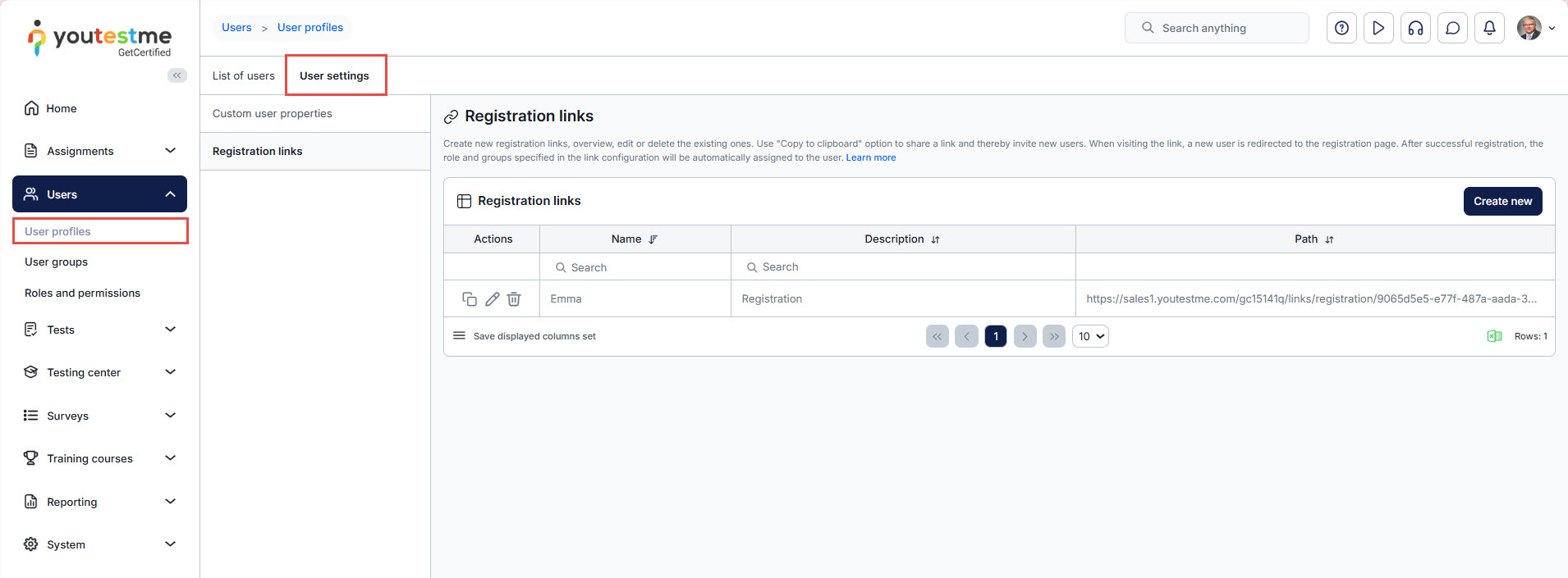 In the User Settings tab, select the “Registration Links” option and click the “Create new” button.