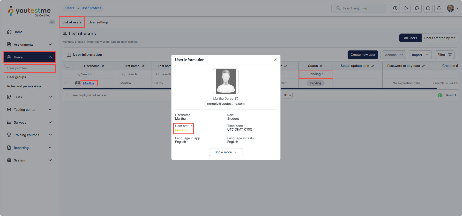 Note: If registration requires a manager’s approval, users will still submit their registration request using the registration link. Even before approval, the user will appear as a member of the user group specified by the link configuration. However, when you view the user’s profile, their status will be shown as ‘Pending’ until the registration is approved.
