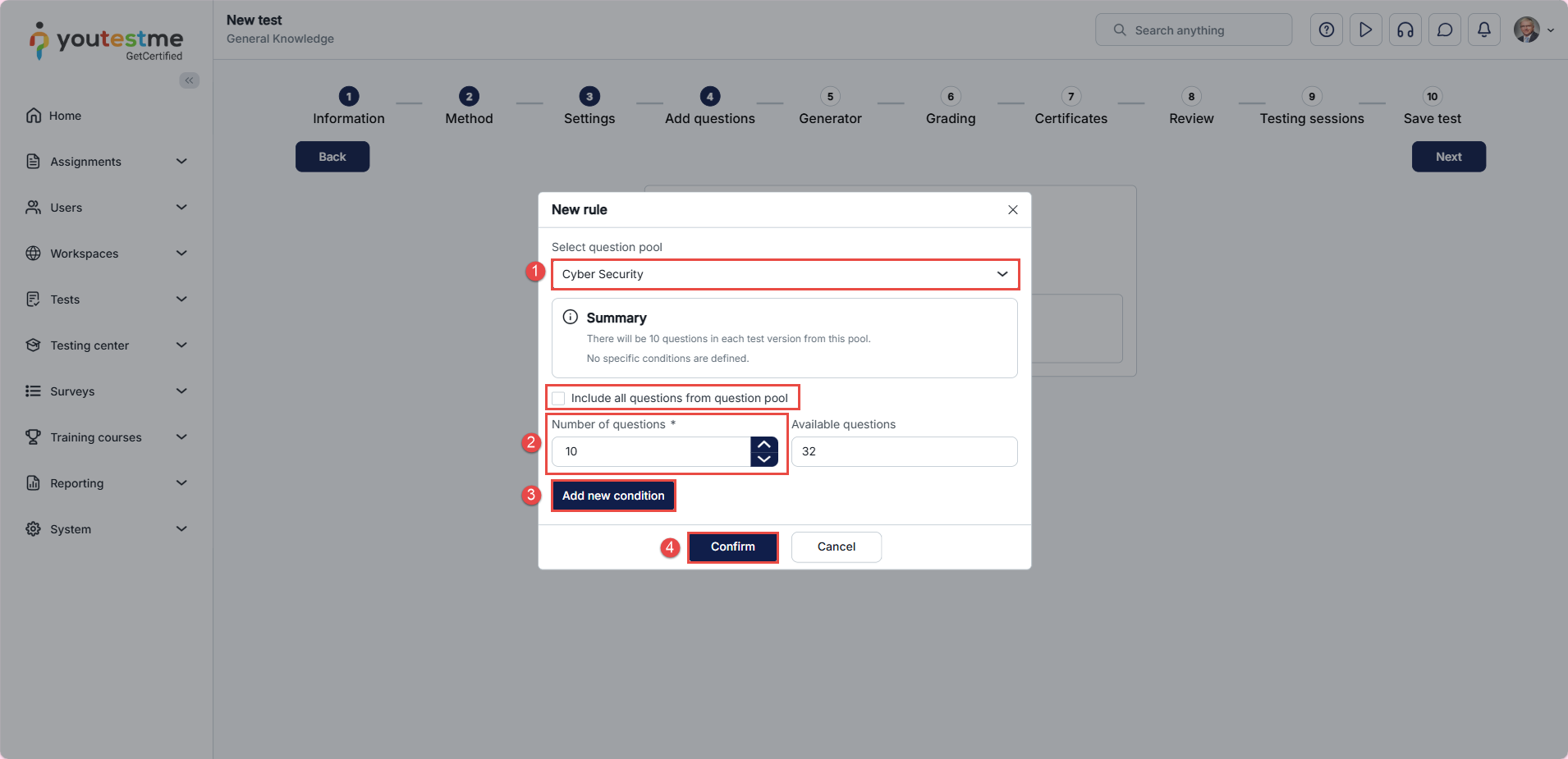 - Click the Select Question Pool button to add questions from the desired question pool.