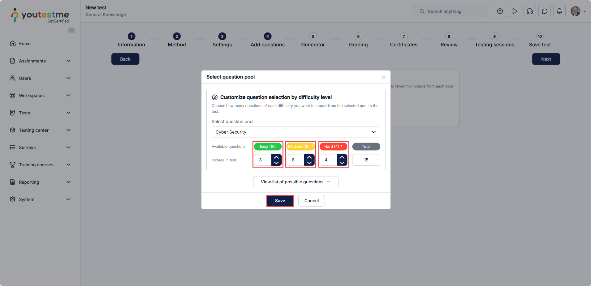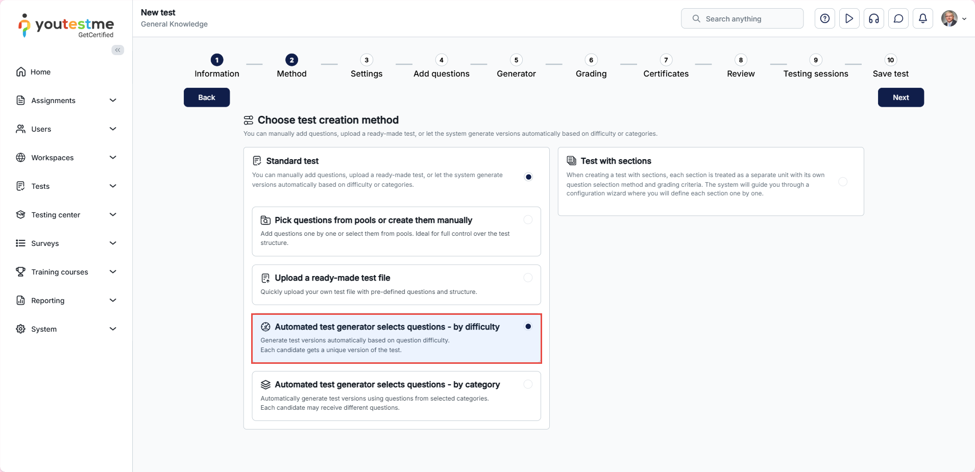 At the second step of the Test Creation Wizard, choose the Automated test generator selects questions – by difficulty option.