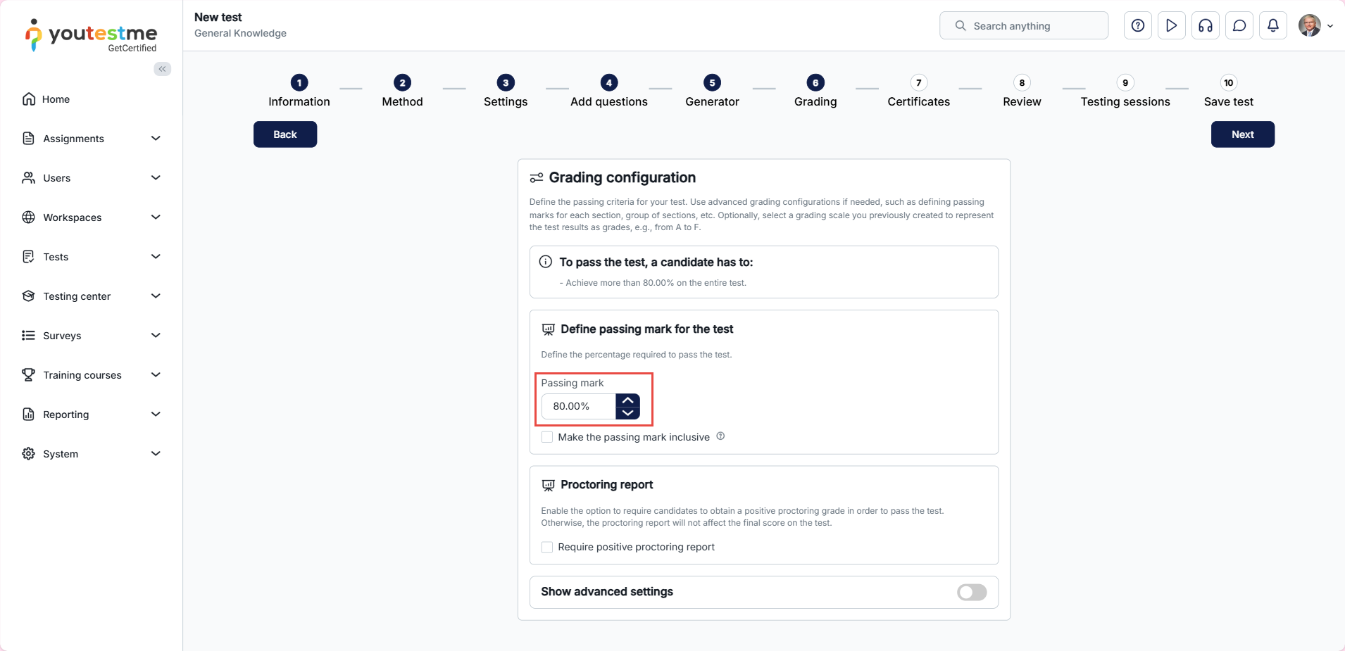 Note: During the sixth step of the test creation wizard, the passing score can only be defined as a percentage. This limitation exists because when including the questions with the By Answer Weight scoring method, the score in points cannot be the same across all generated versions.