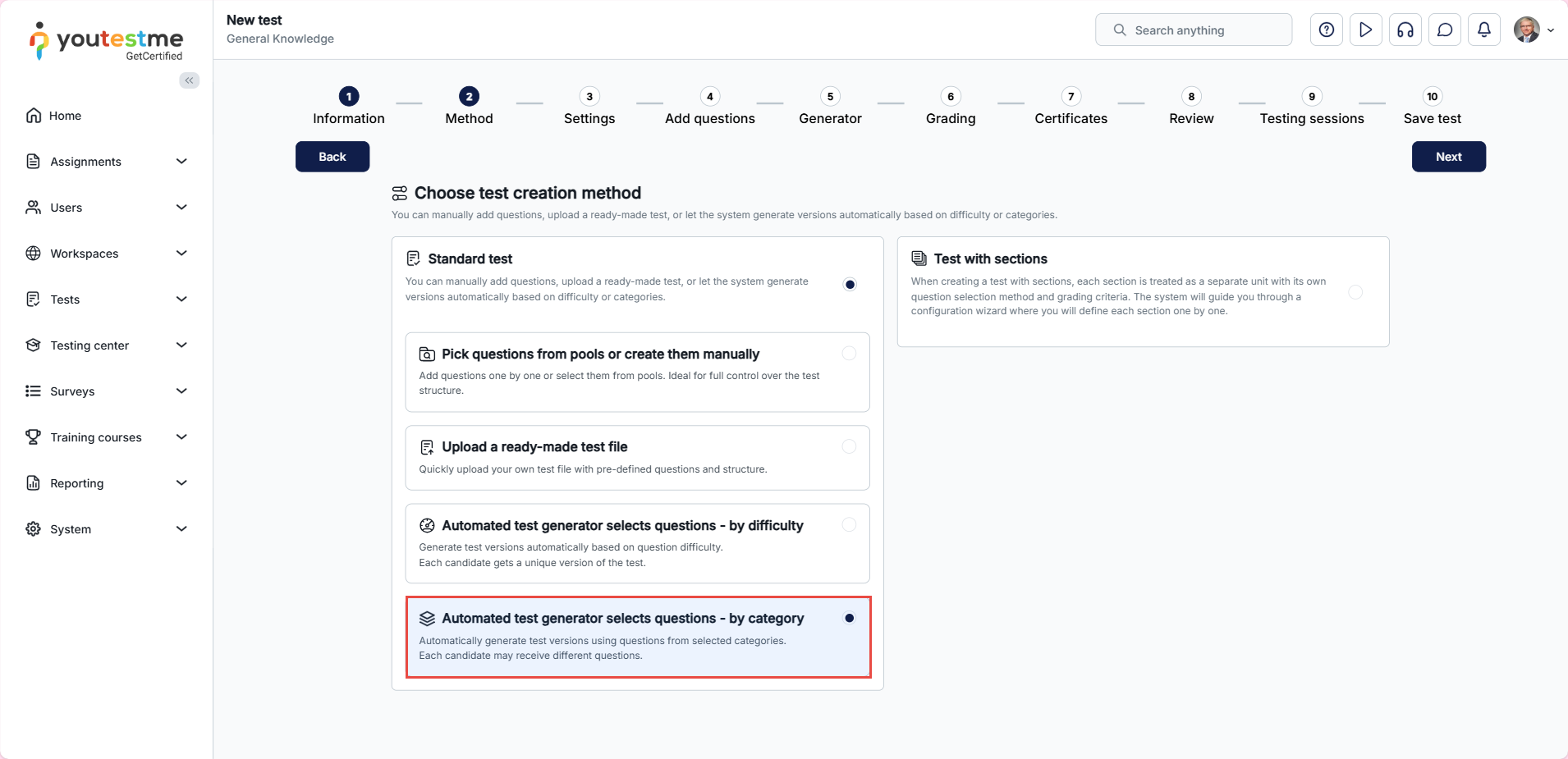 At the second step of the Test Creation Wizard, choose the Automated test generator selects questions – by category option.