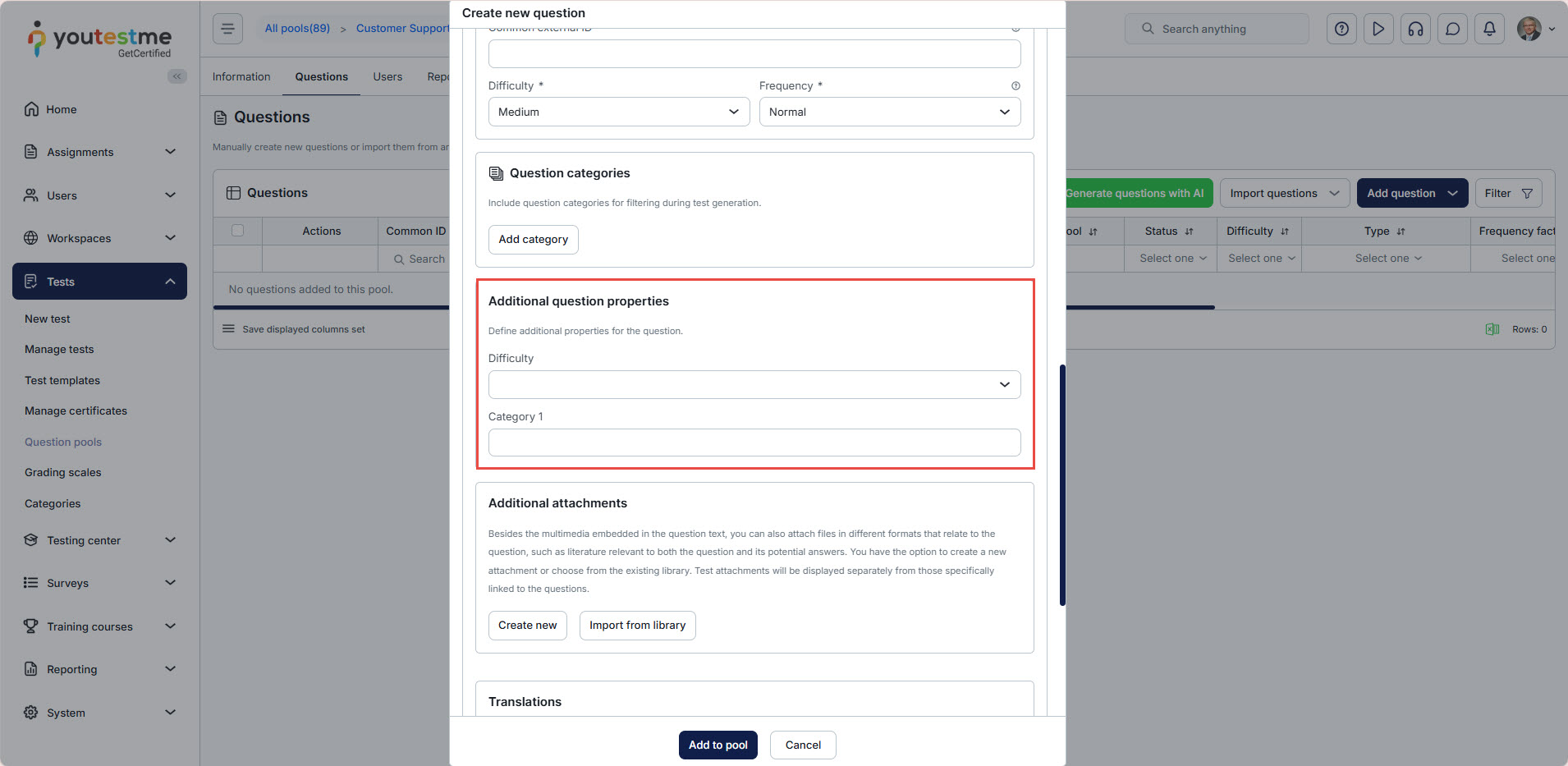 Note: The same applies when creating a question from the Question pool tab and the Test Creation Wizard. Please note that only Single-choice and Multiple-choice questions can have answer attachments.