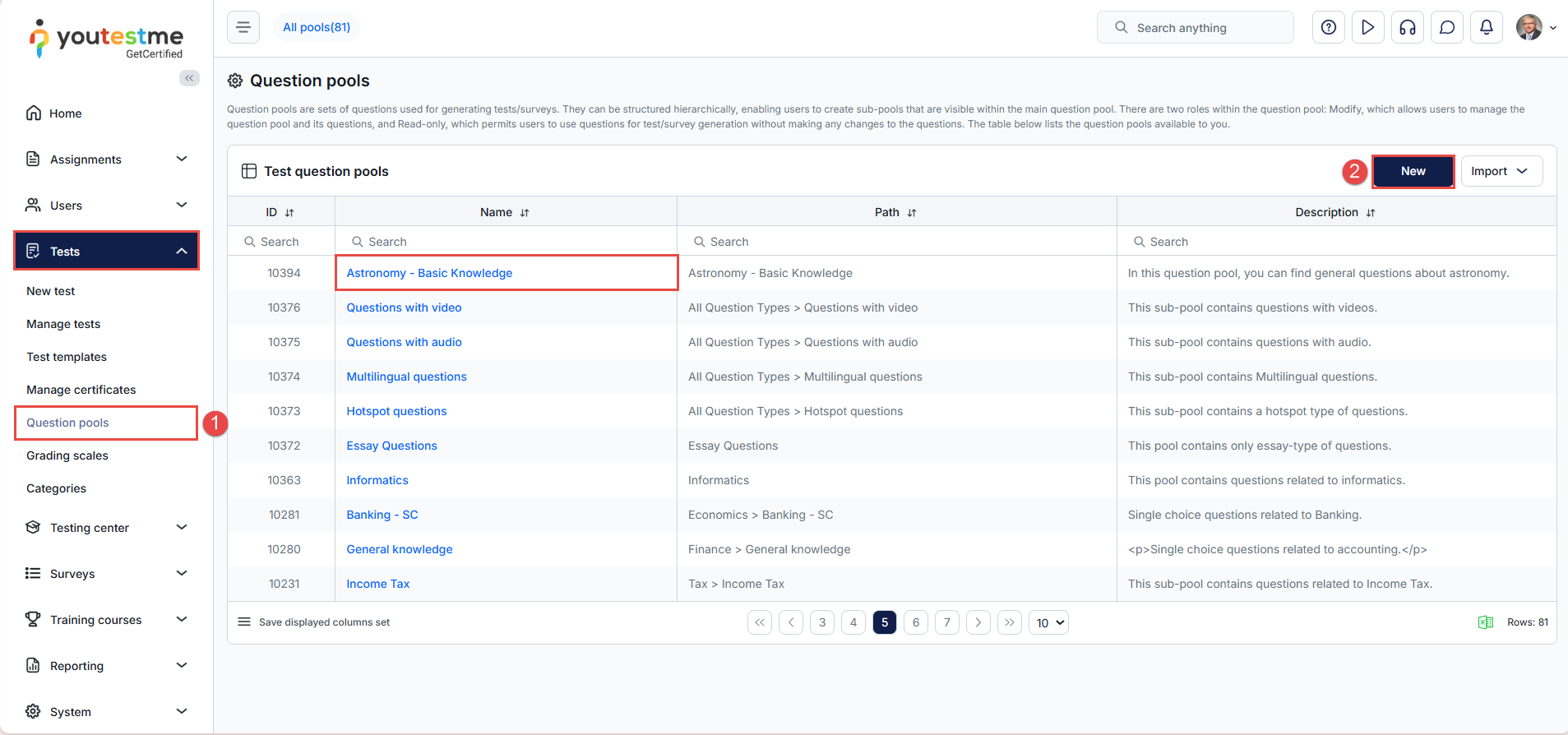 - Select the desired question pool by clicking its name, or click the New button to create a new question pool.