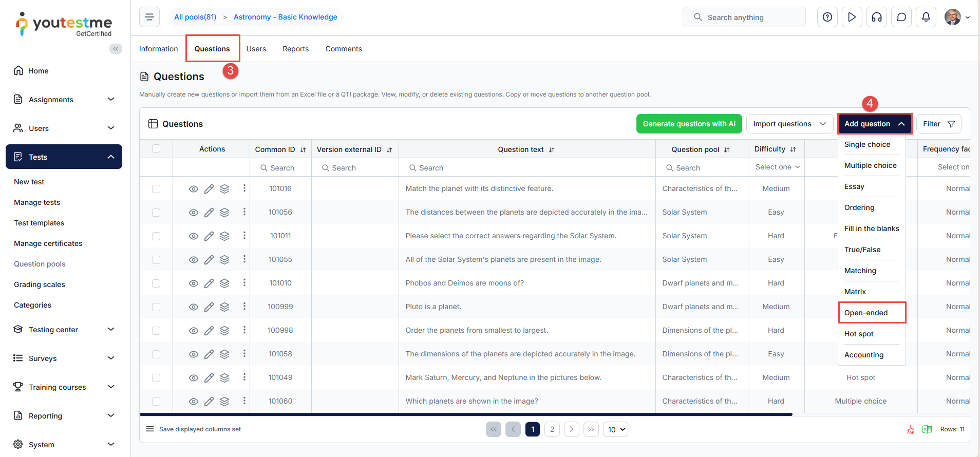 - On the main menu, select Tests, then click the Question Pools sub-menu.