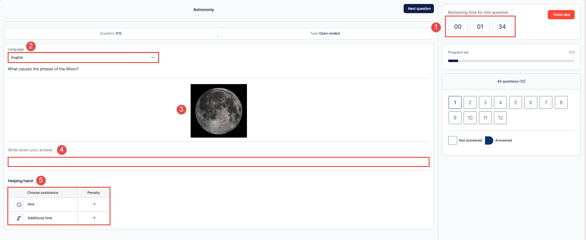- Timer Display: If the test is configured to use a time limit per question, the remaining time for the current question will appear in the top right corner. This helps test-takers manage their time efficiently.