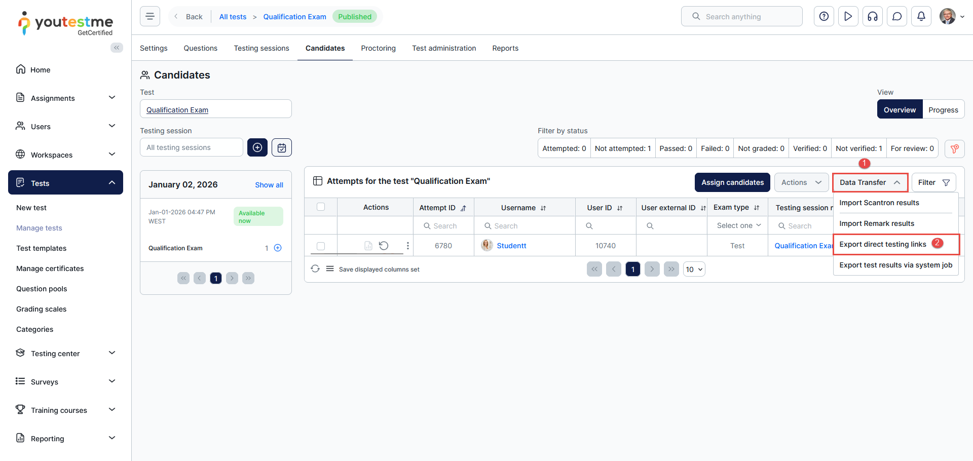 Once you create a test and assign candidates to the session, you can generate shared test links.