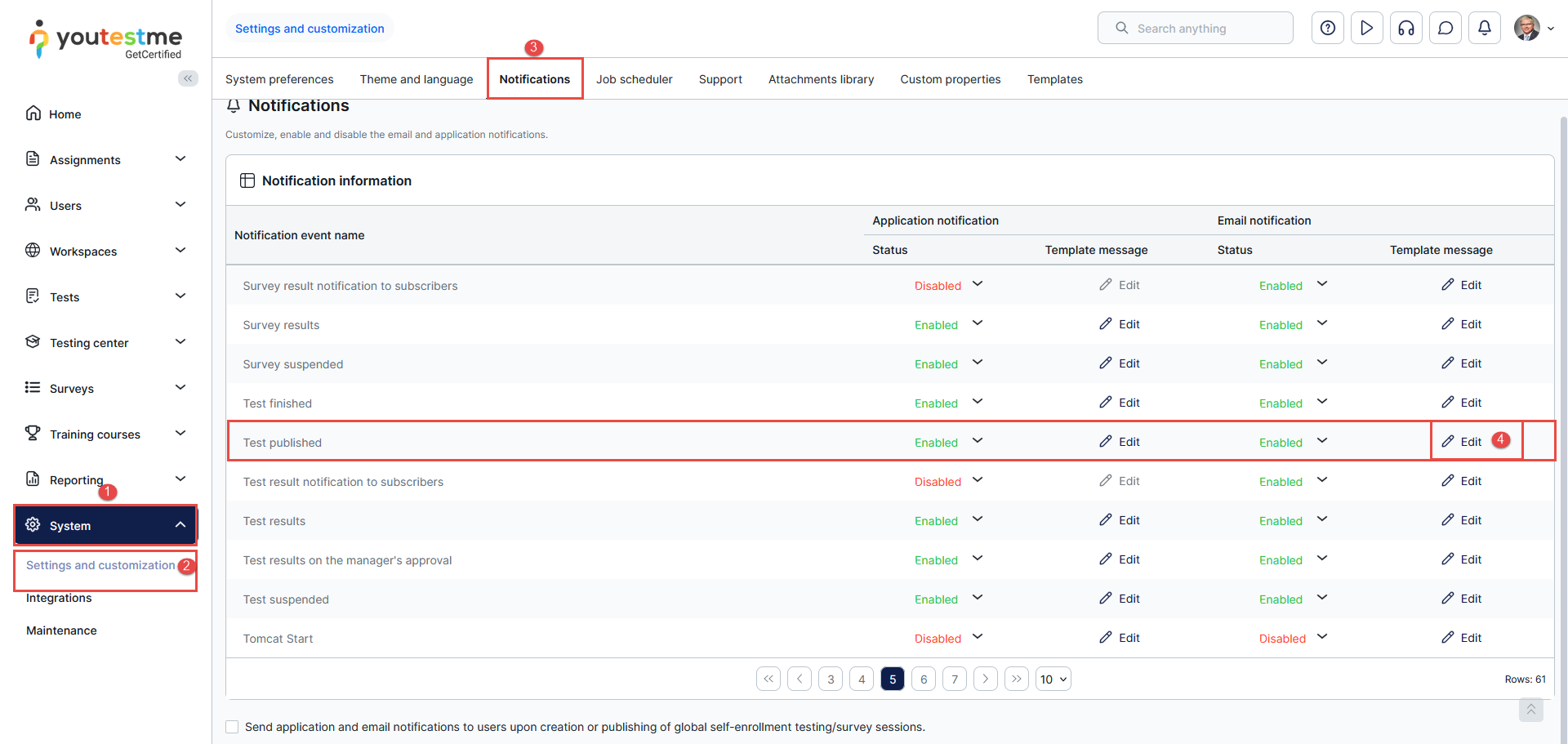 - Find the desired notification and click on the Edit option in the e-mail notification column.